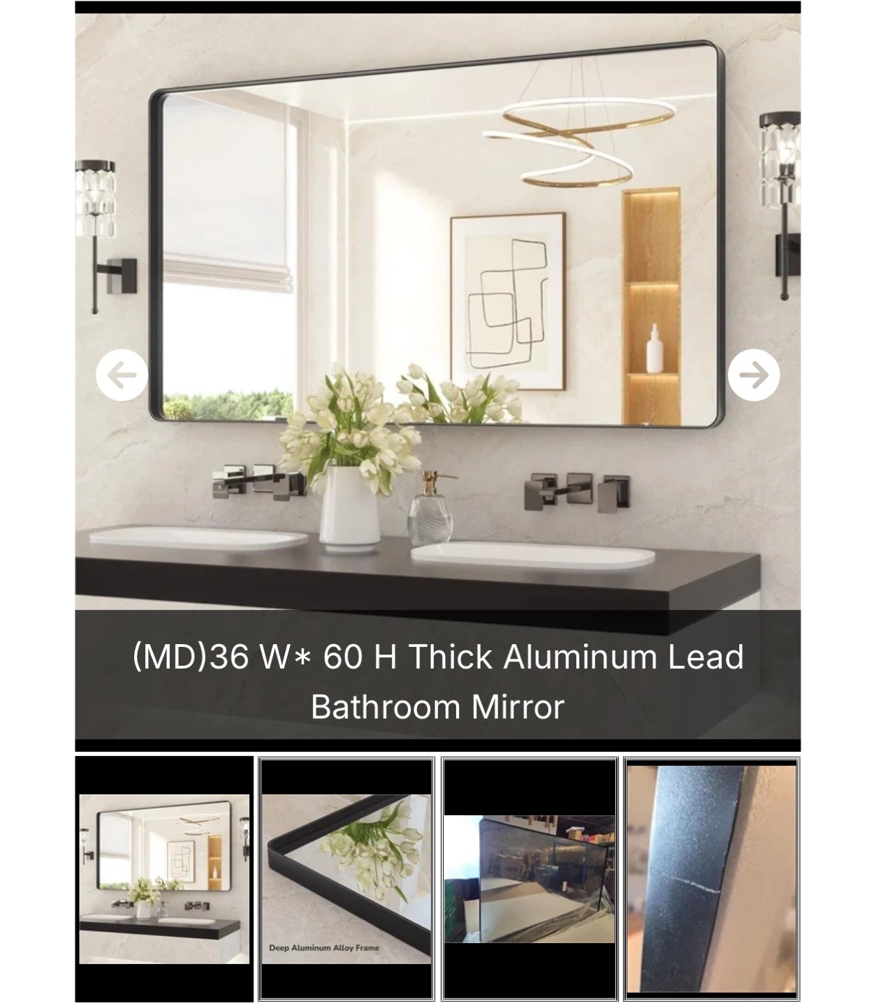 This is a thick aluminum bathroom mirror. It measures 36 inches wide by 60 inches high. The frame is made of deep aluminum alloy.