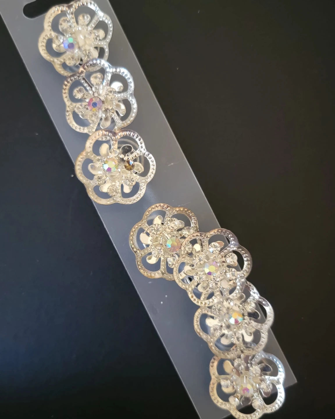 This is a set of five decorative flower embellishments. Each embellishment features a silver-tone metal filigree design with clear and iridescent rhinestones. These are perfect for adding sparkle to crafts or clothing projects!