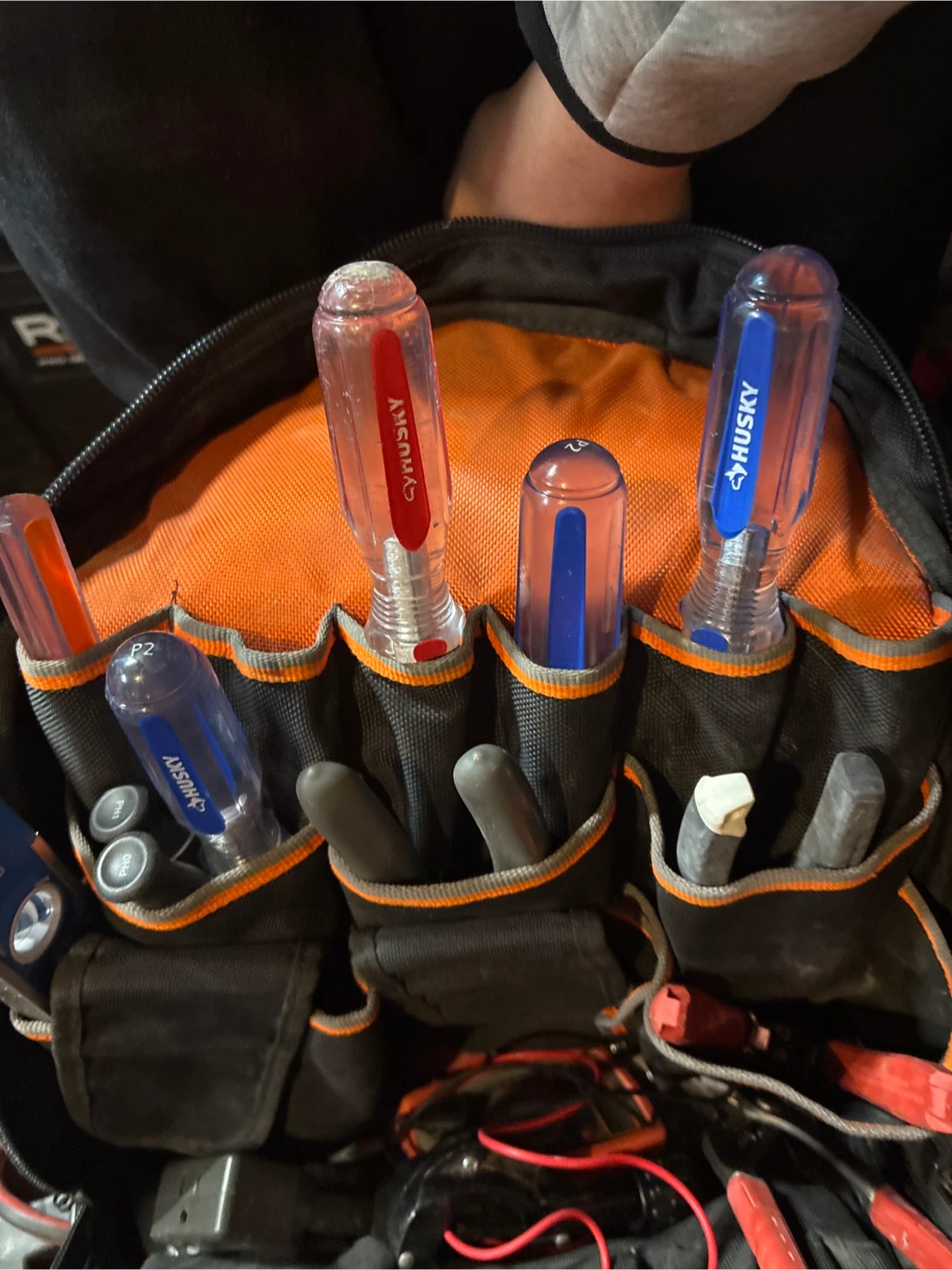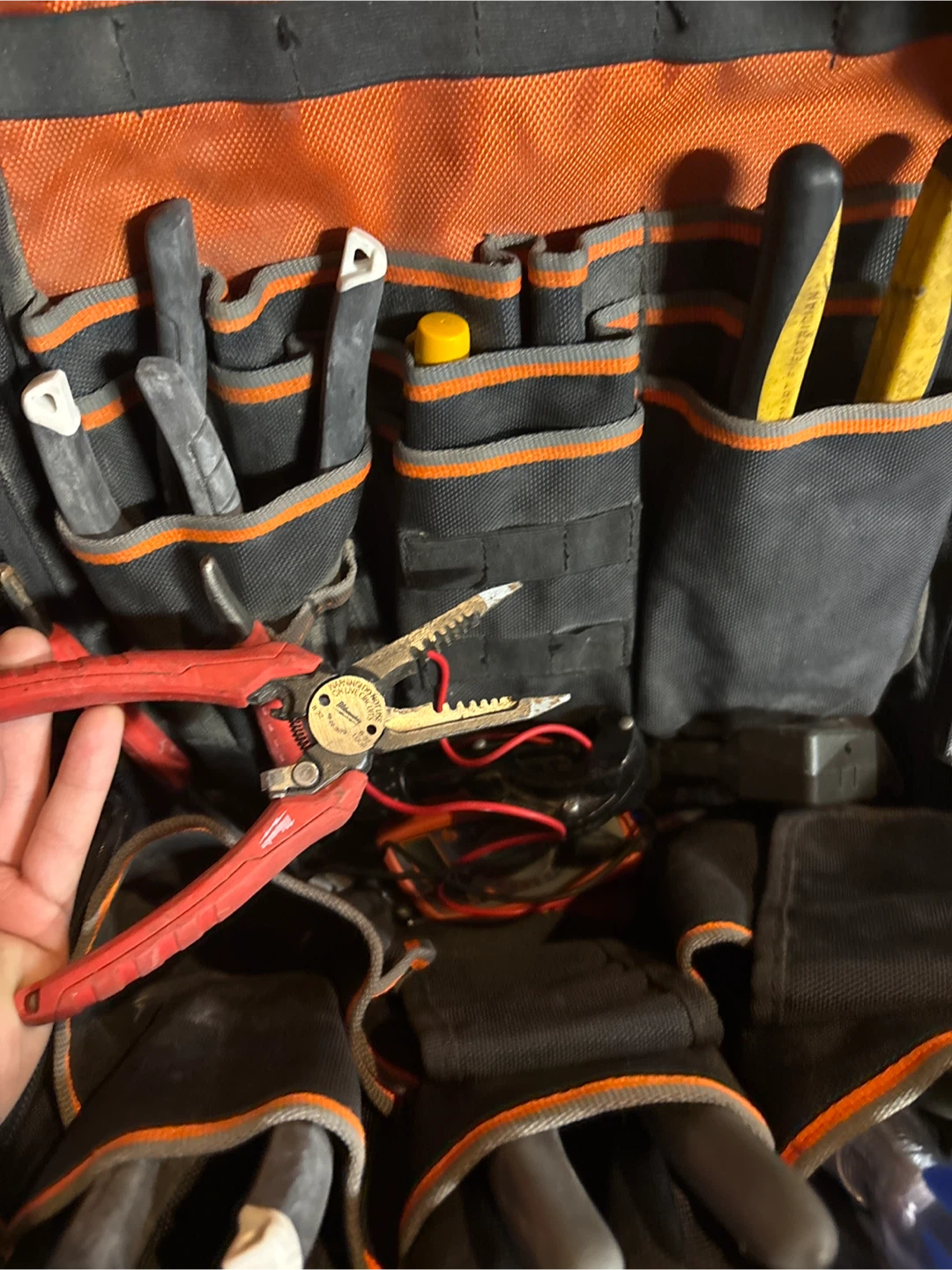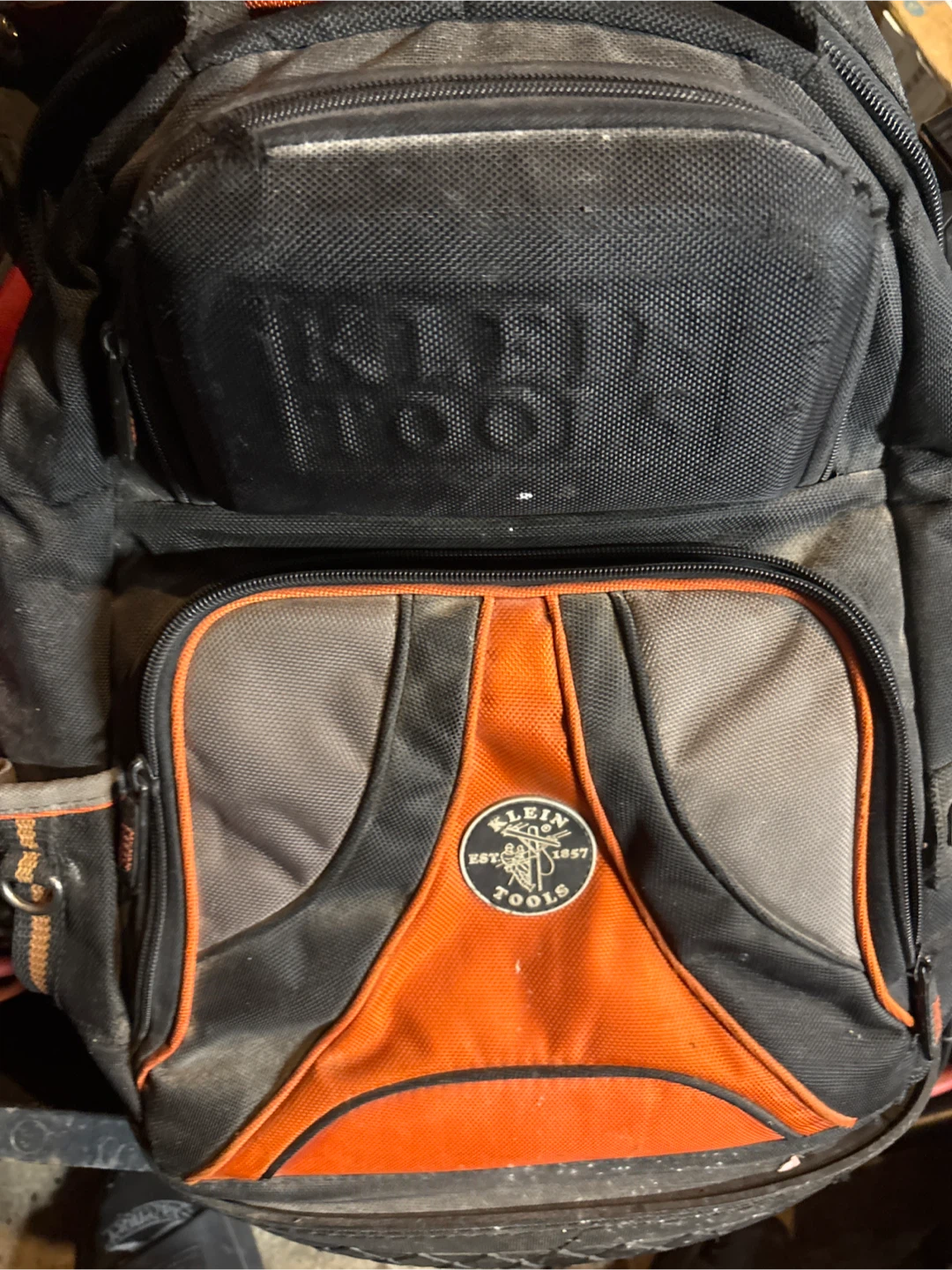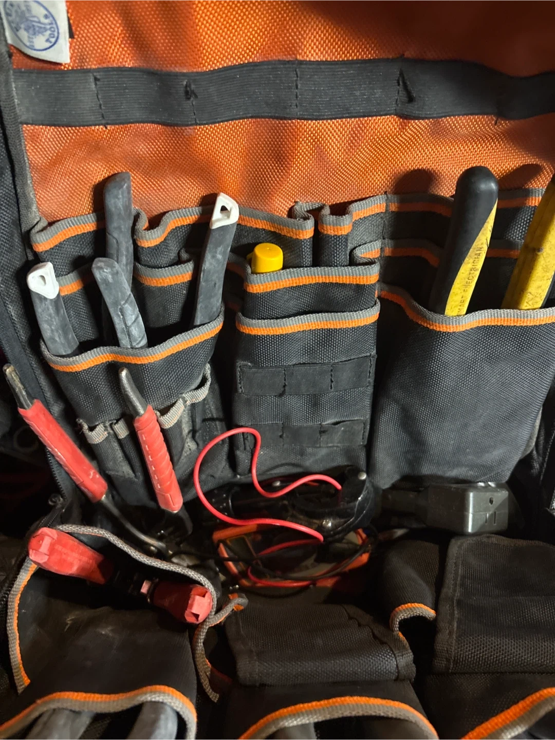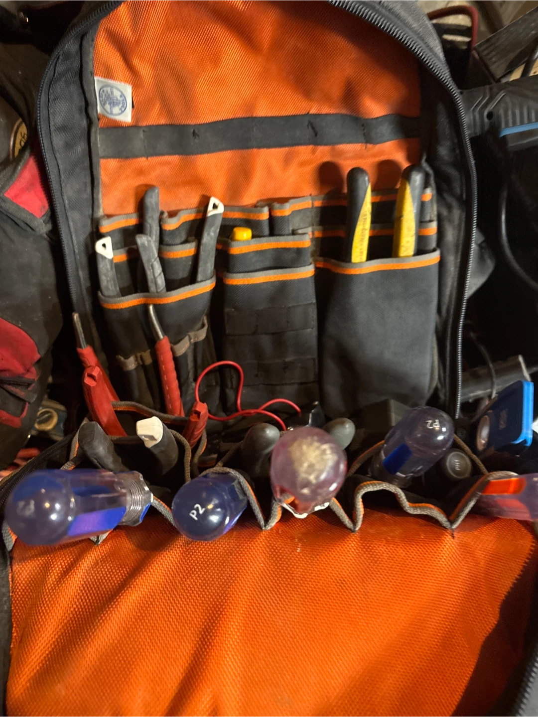 Durable Klein Tools backpack for electricians. Features multiple pockets and compartments for organizing tools. Made with tough canvas material. Includes various hand tools and electrical supplies.