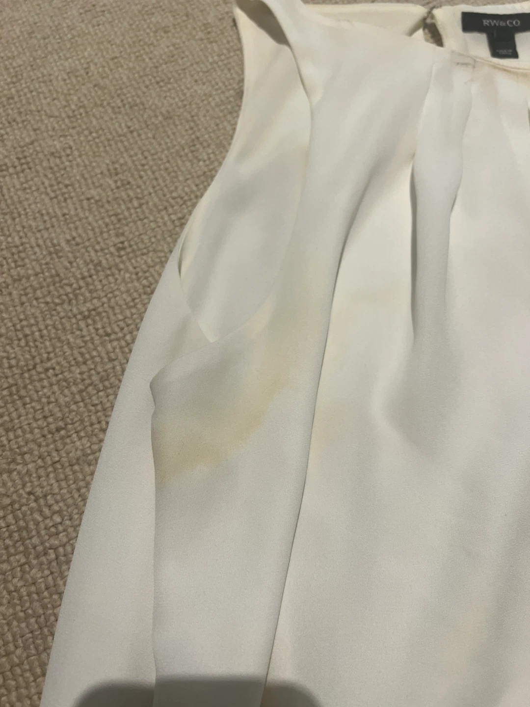 This white sleeveless blouse is from RW&CO. It has some staining on the neckline and underarm. It's a size medium. The perfect work top - just needs a little TLC.