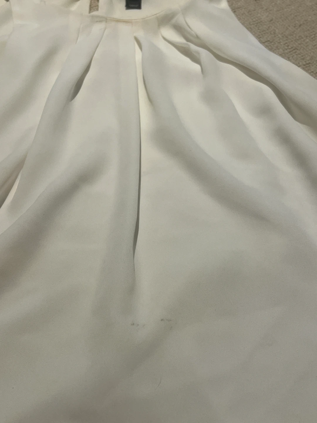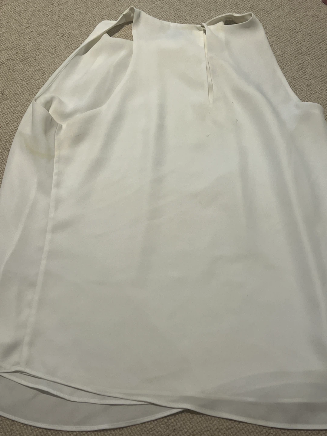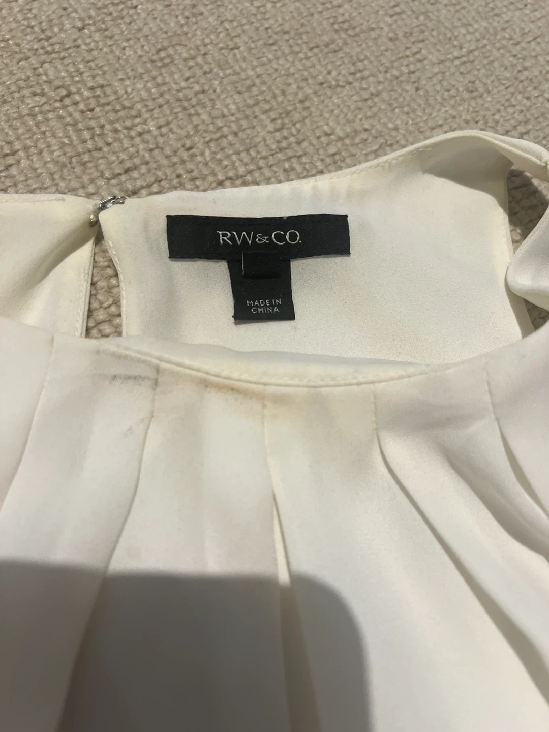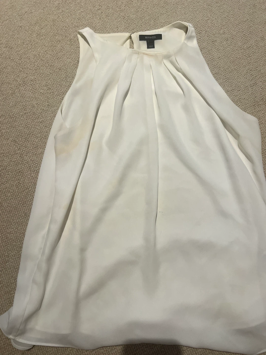 This white sleeveless blouse is from RW&CO. It has some staining on the neckline and underarm. It's a size medium. The perfect work top - just needs a little TLC.