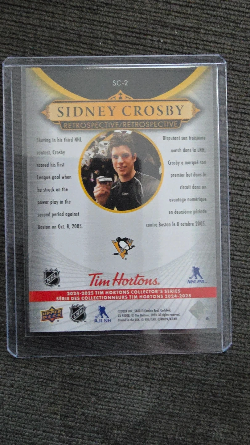 This is a Sidney Crosby Retrospective hockey card from Upper Deck. It commemorates his career highlights and achievements. The card features a "SC-2" designation and details his first league goal on October 8, 2005. It's part of the 2024-2025 Tim Hortons Collector's Series.