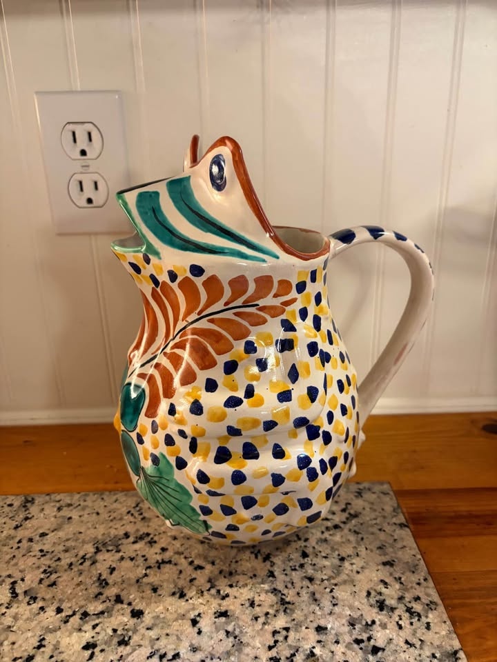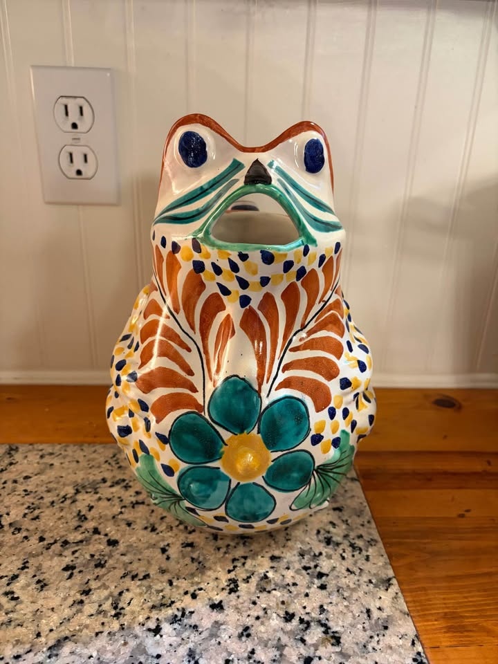 Unique frog pitcher. Hand-painted pottery with vibrant colors and a fun design. Great for serving drinks or just as a decorative piece. Retails for $85 USD. Pick up East Abbotsford.