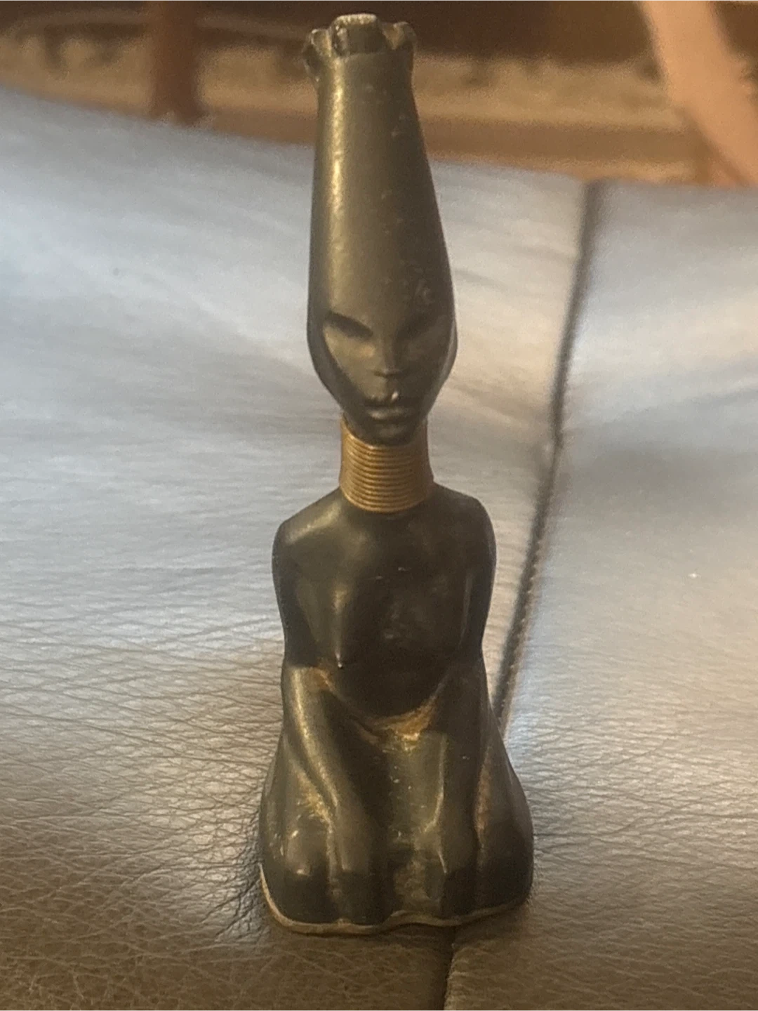 Design: Features a stylized figurine of a kneeling woman with a long neck adorned with brass rings, often referred to as a "Ubangi" neck ring style.