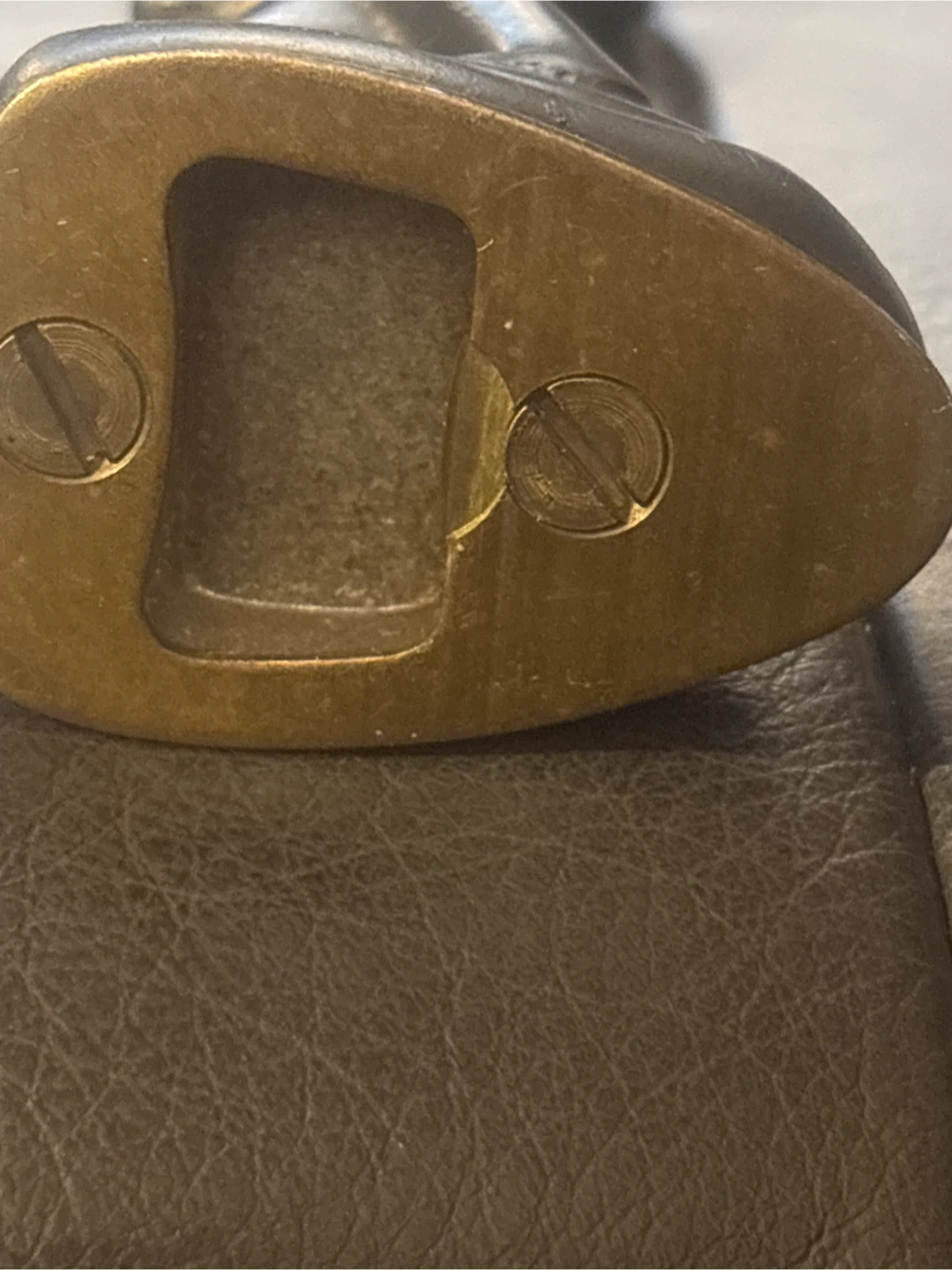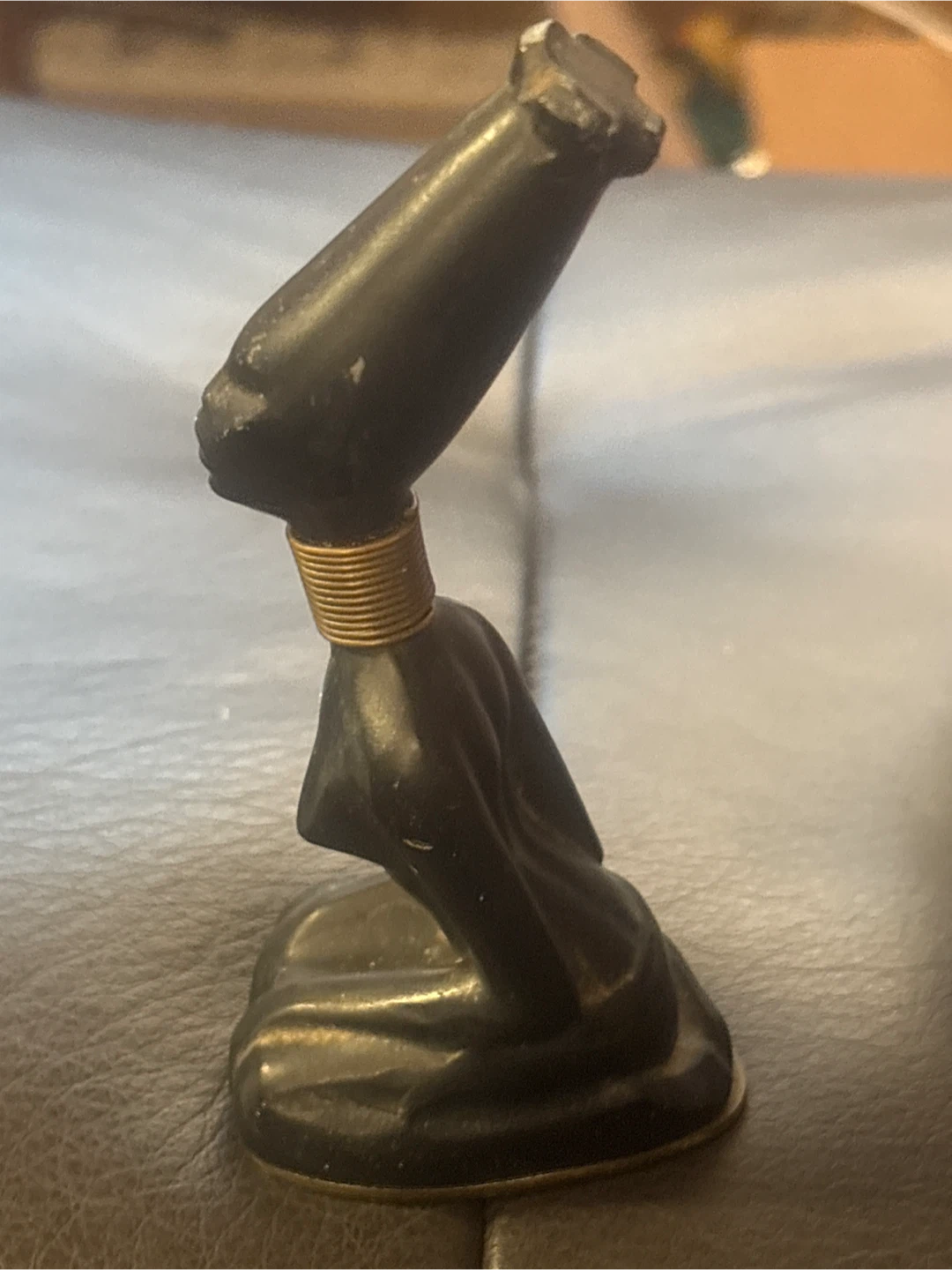 This unique metal figurine depicts a seated figure with an elongated head, adorned with a golden neckpiece. It's made of a dark metal with brass accents on the base and neck. The item's base has a cut-out and screw holes, suggesting it might have been part of a larger mechanism or a custom piece.