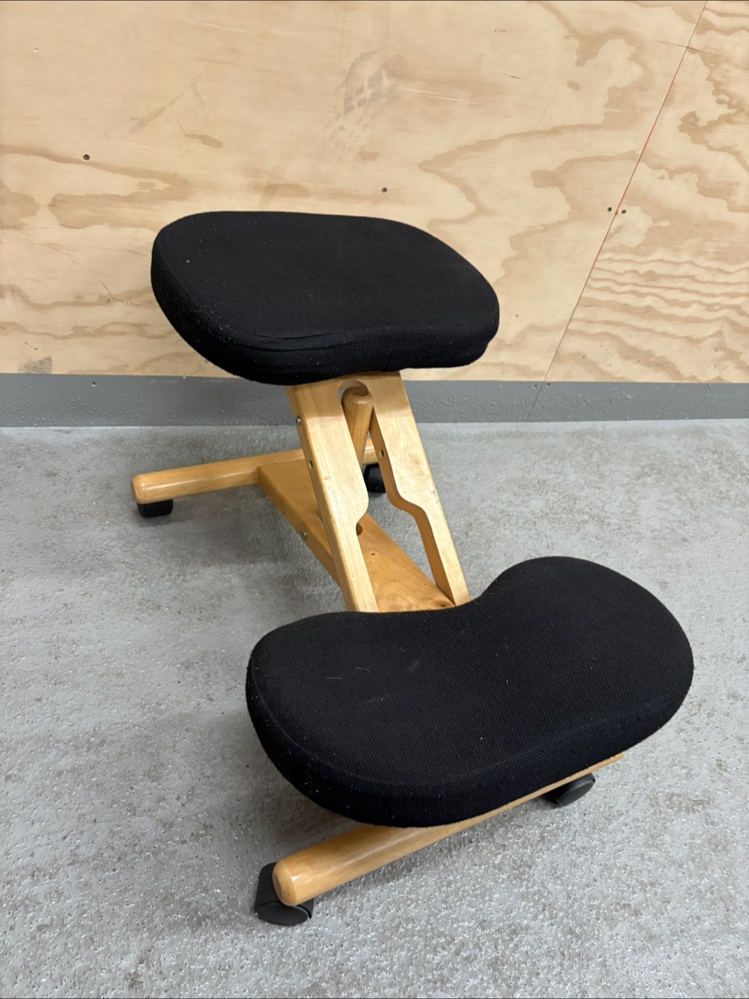 An ergonomic kneeling chair. The chair features two padded seats for the knees and seat. Crafted with a wooden frame. This chair is perfect for improving your posture.