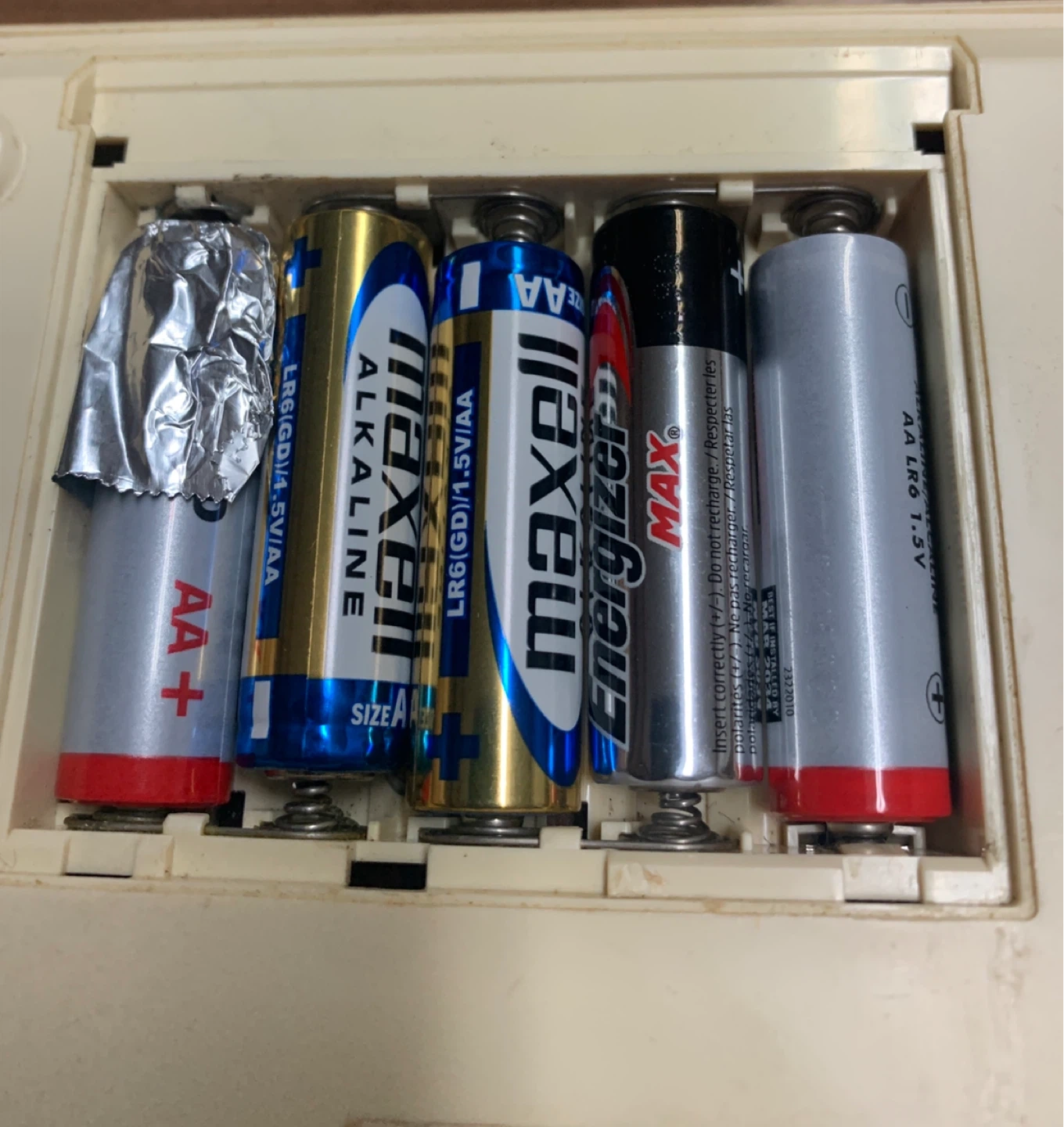 5 AA Batteries included. (Aluminum foil is being used as one of the battery contact springs has broken off - see pic).