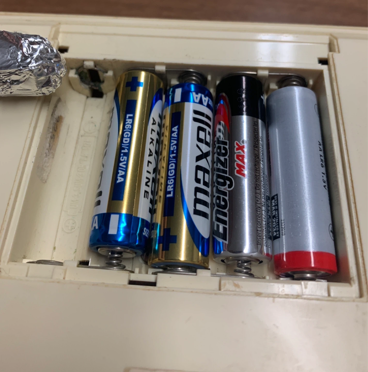 5 AA Batteries included. (Aluminum foil is being used as one of the battery contact springs has broken off - see pic).