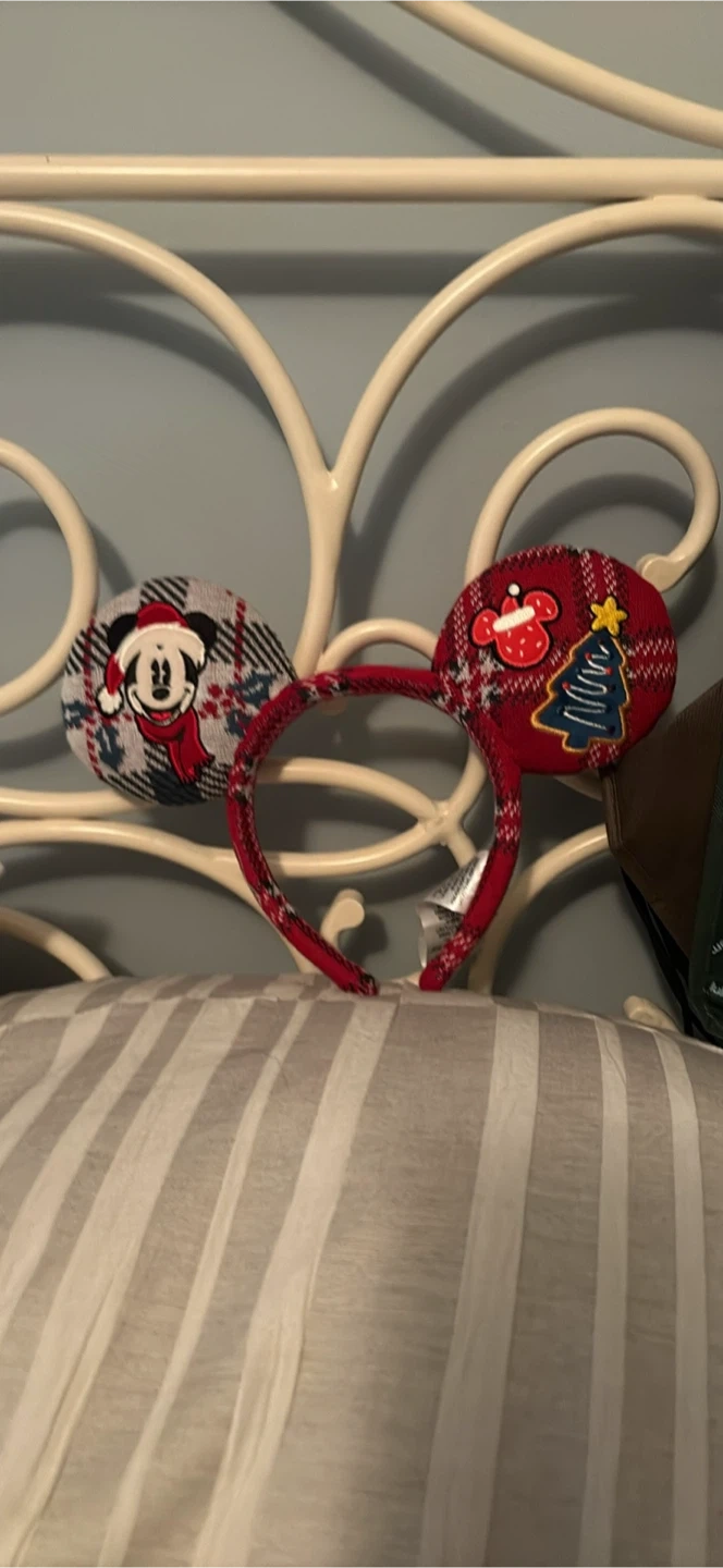 Festive Disney Mickey Mouse headband with a holiday theme. It features red plaid fabric with embroidered Mickey Mouse and Christmas tree designs. A fun accessory for holiday events or everyday wear!