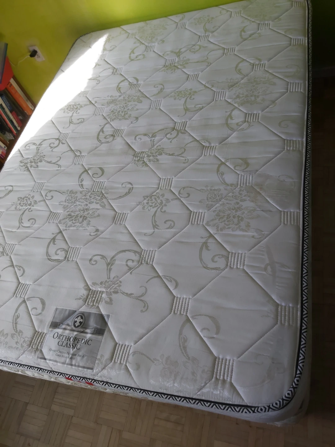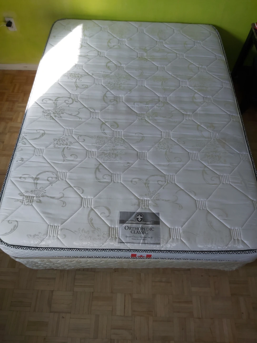 Very good condition full/double size mattress by Orthopedic Classic. Canadian made. Used very lightly and aired out in the sun. A bit on the firm side. Bedframe with skirt also available, as well as cleaned bedsheets, if needed.