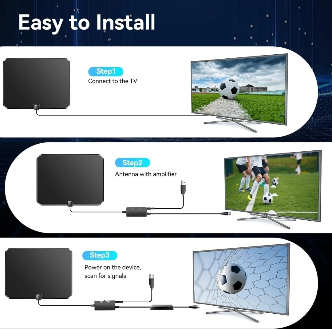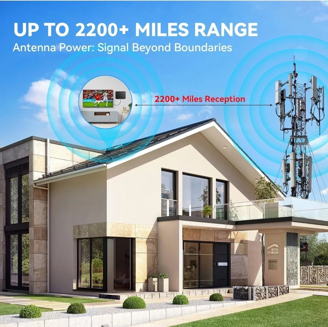 This indoor TV antenna offers a 2200+ mile range with a 2026 upgrade and signal booster. It supports 4K 8K HDTV and Smart TVs. Includes an 18ft coaxial cable and amplifier. Copper wire construction ensures strong signal reception.