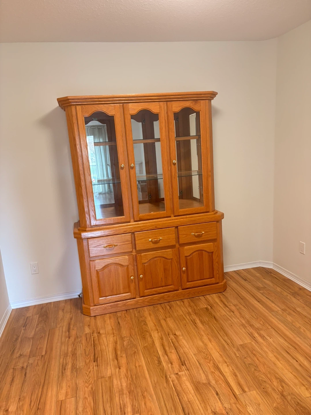 This oak china cabinet features three glass-front doors on top and three drawers and three cabinets on the bottom. It's made of wood with brass-coloured hardware. This piece offers ample display and storage space for your dining room or living area. Pickup only no deliveries bring manpower to move