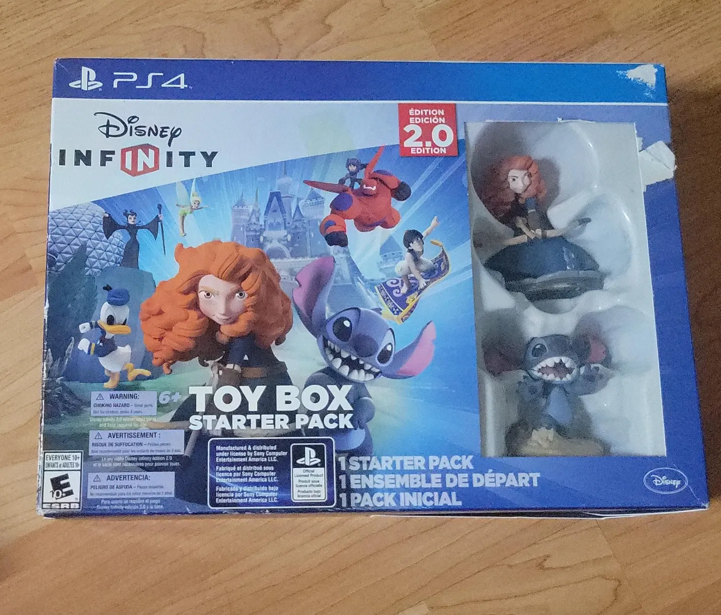 This is the Disney Infinity 2.0 Toy Box Starter Pack for PlayStation 4. It includes figures for the game. The packaging indicates it's a starter pack with multiple characters.
