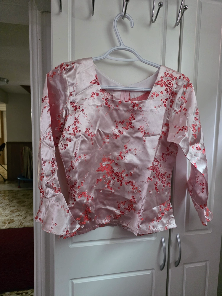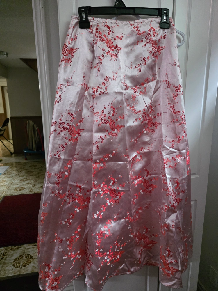 Beautiful matching set, perfect for special events. The top features long sleeves and a square neckline. The skirt is long and flowy. It is a great outfit for a relaxing day out.