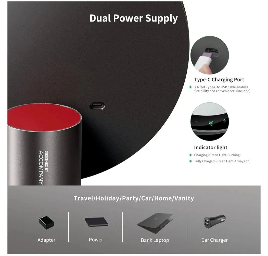 【USB rechargeable and built-in 2000 mAh Battery】 AMIRO makeup mirror has a built-in 2200 mAh rechargeable lithium battery, which continuously works for up to 3-5h after fully charged. It can be charged through a USB by a power bank, PC, etc., and work lighted for a long time. Convenient to move the vanity mirror with lights to another desk. Note: The USB-C cable is in the box.