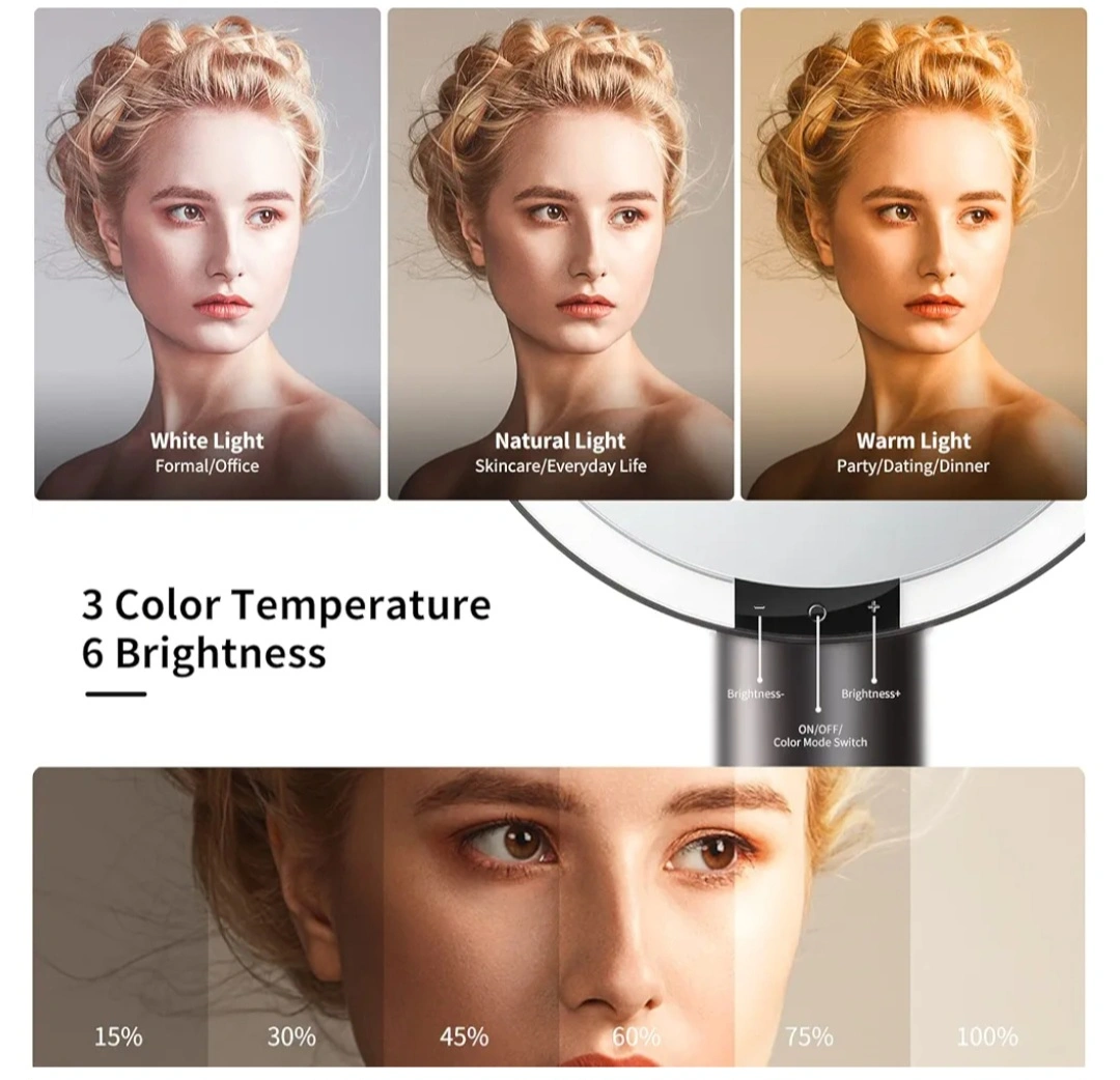 【Makeup Mirror, With Small 10X Magnifying mirror】9'' size vanity mirror, entire face in HD view. With a small 10X Magnifying mirror for applying detailed makeup, wearing contact lenses and eyebrow tweezing, shaving, hair styling, and facial care. Makeup mirror built-in Premium bright led lights can light the darkest and poorly lit areas, natural and soft, bright but not dazzling. Easily switch the color to see how exactly your makeup will look in various lighting situations.