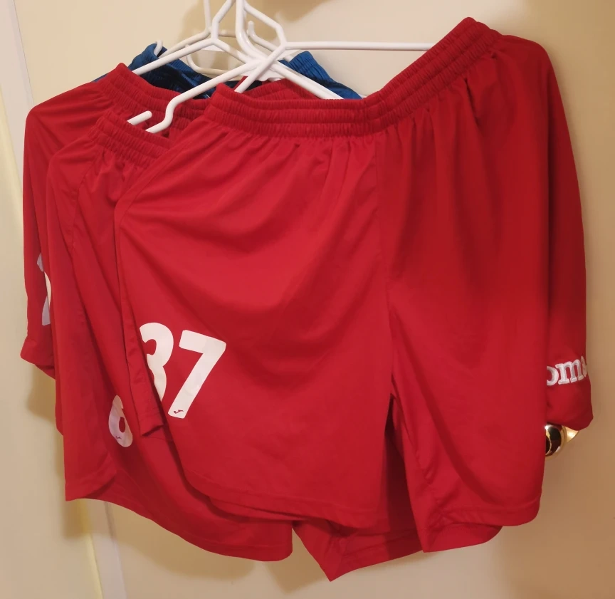 Red Joma soccer shorts. Features white numbers on the back. They're made of polyester. These shorts are great for playing sports! $10 for each one.