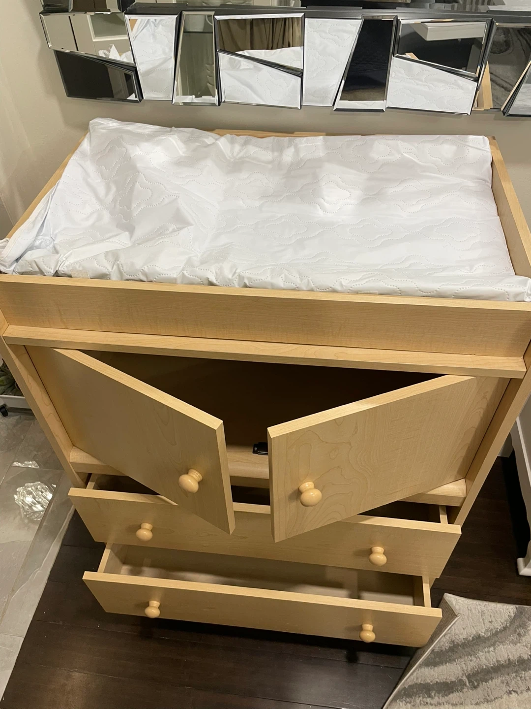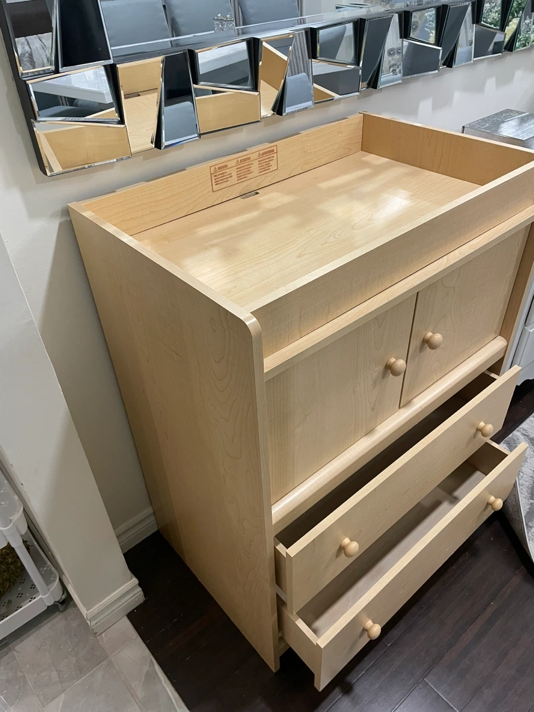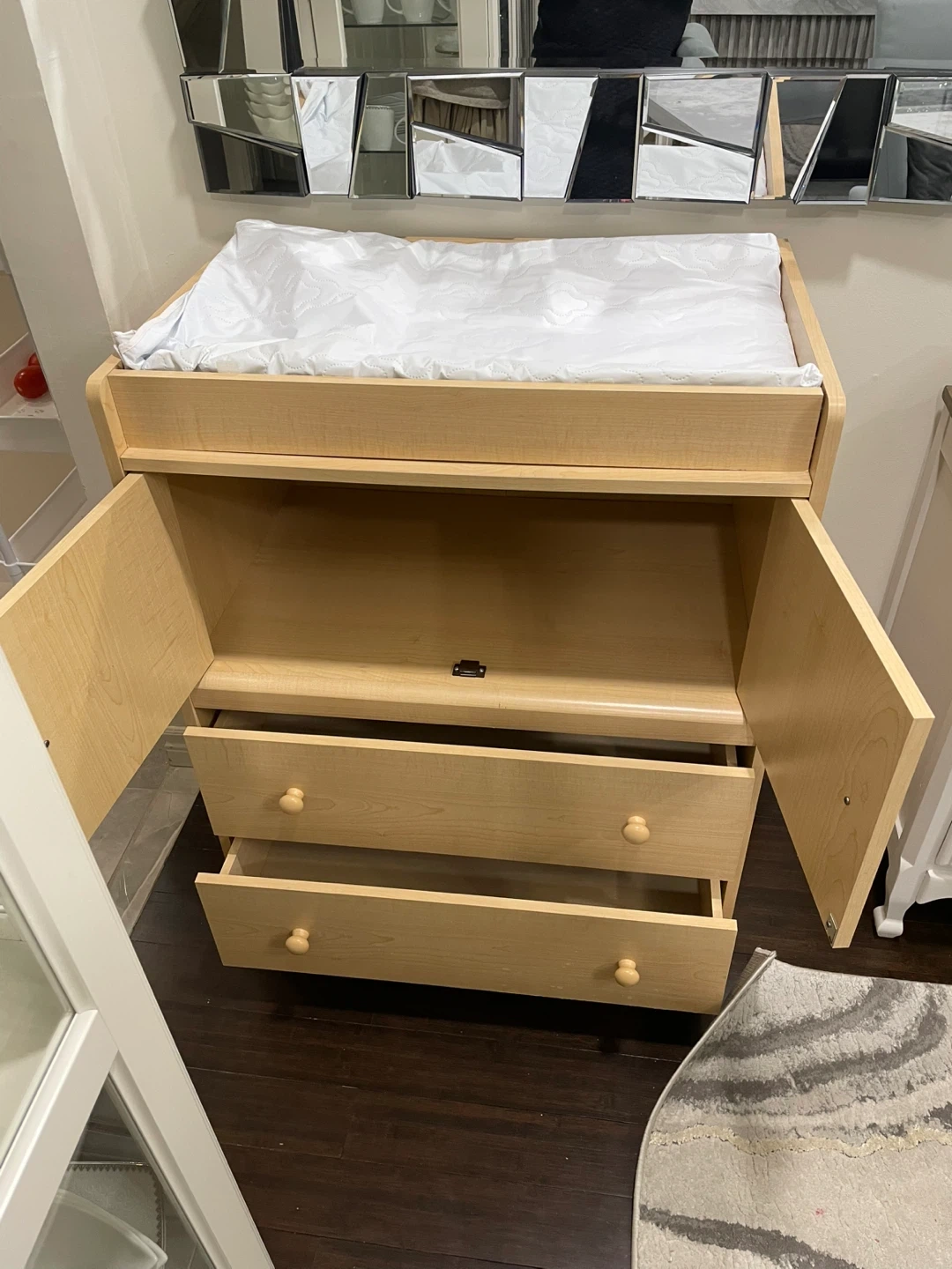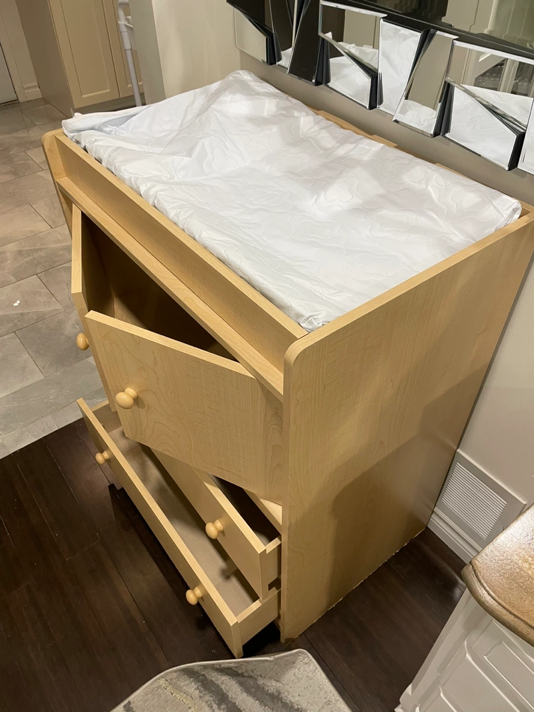Changing table in good condition! It's a light wood colour and features drawers for storage. Perfect for keeping baby essentials organized and within reach during diaper changes