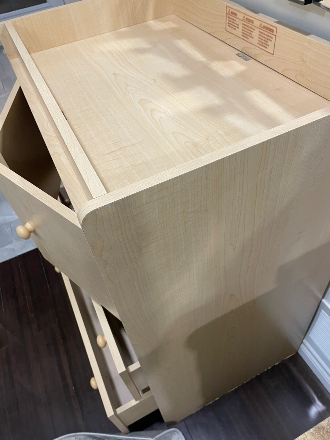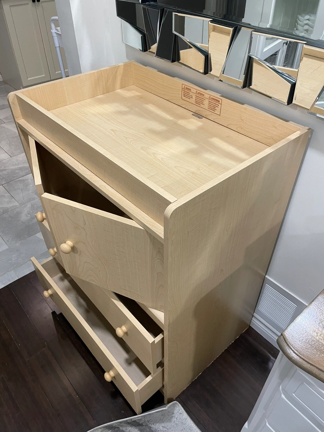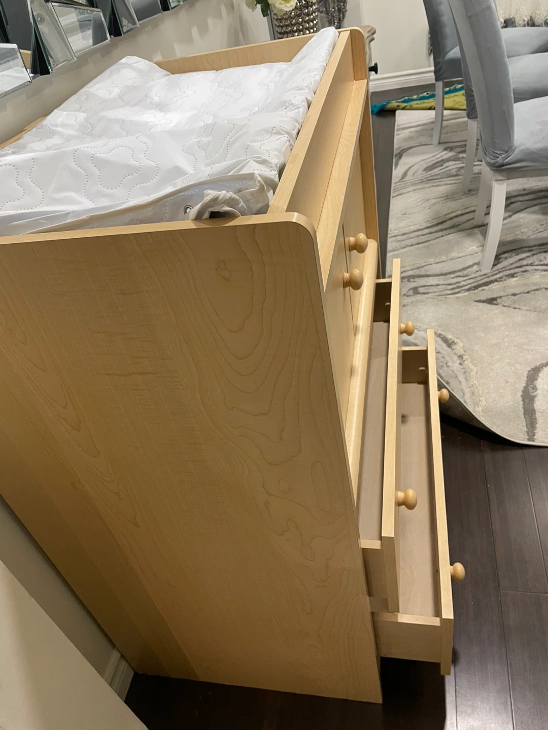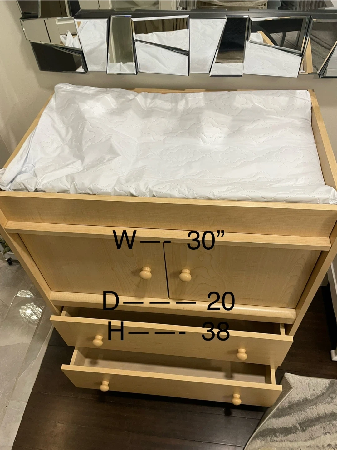 Changing table in good condition! It's a light wood colour and features drawers for storage. Perfect for keeping baby essentials organized and within reach during diaper changes
