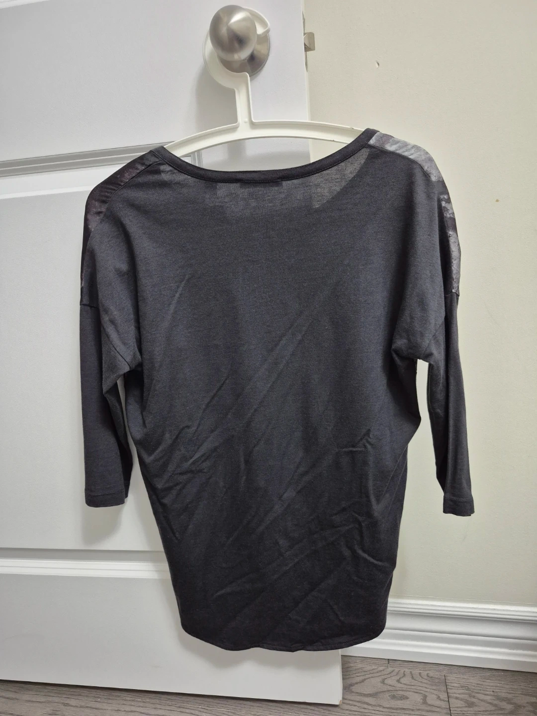 This Mona Lisa top features a striking black and grey landscape print on the front. It has a V-neck and 3/4 sleeves. The back is a solid dark grey.