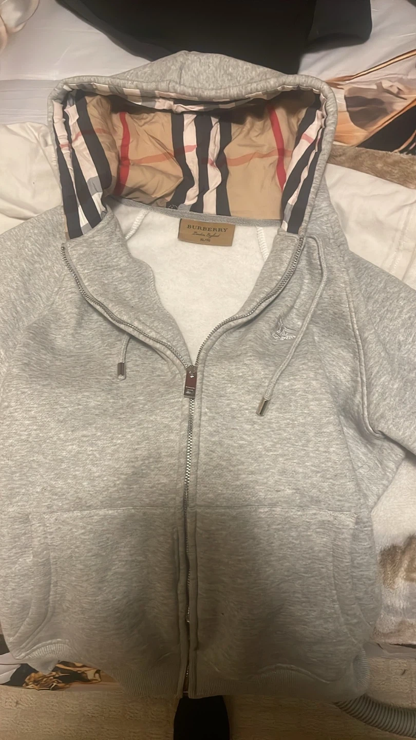 Grey Burberry zip-up hoodie with the iconic checked lining inside the hood. It's size XL/TG. Made from a comfortable material. Fits tight