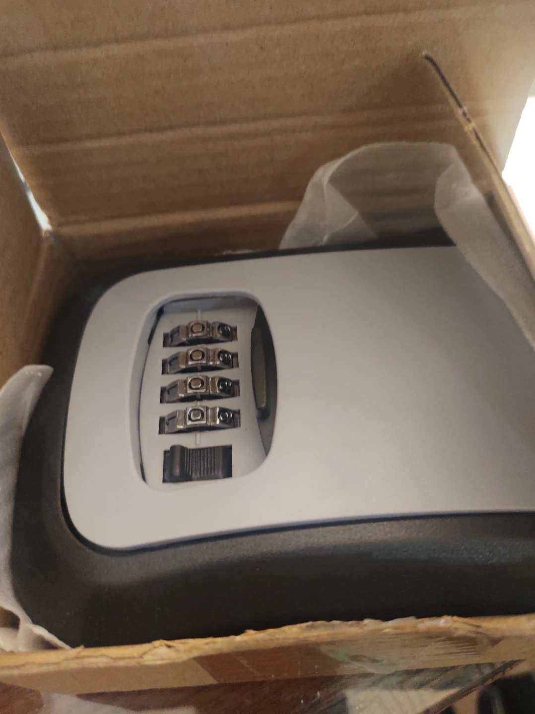 This is a wall-mountable lock box with a 4-digit combination lock. It's made of durable metal and comes in a neutral grey colour. The box includes mounting hardware for easy installation. It's useful for securely storing spare keys outside your home.