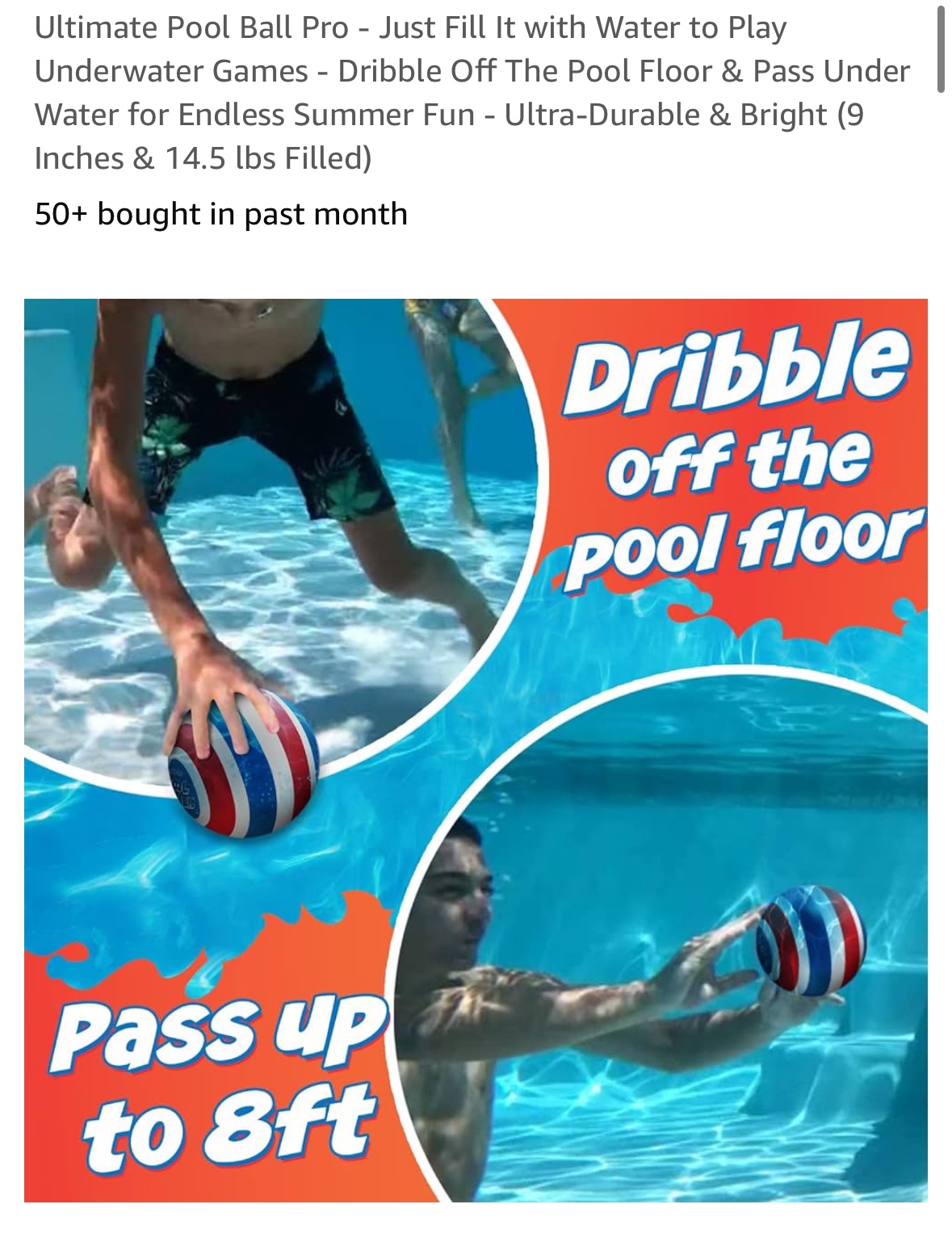 Fun water toy for kids and teens; fills with water for underwater games. Nine inches in diameter and weighs 14.5 lbs when full.