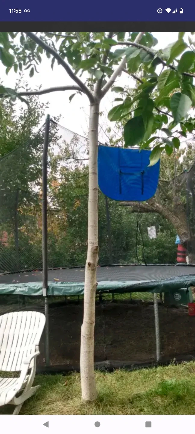 Round trampoline with a green safety pad and black netting enclosure. It has a metal frame and spring cover.Used two summers. Stored during winter. It's ready for outdoor fun in the backyard! Pick up only