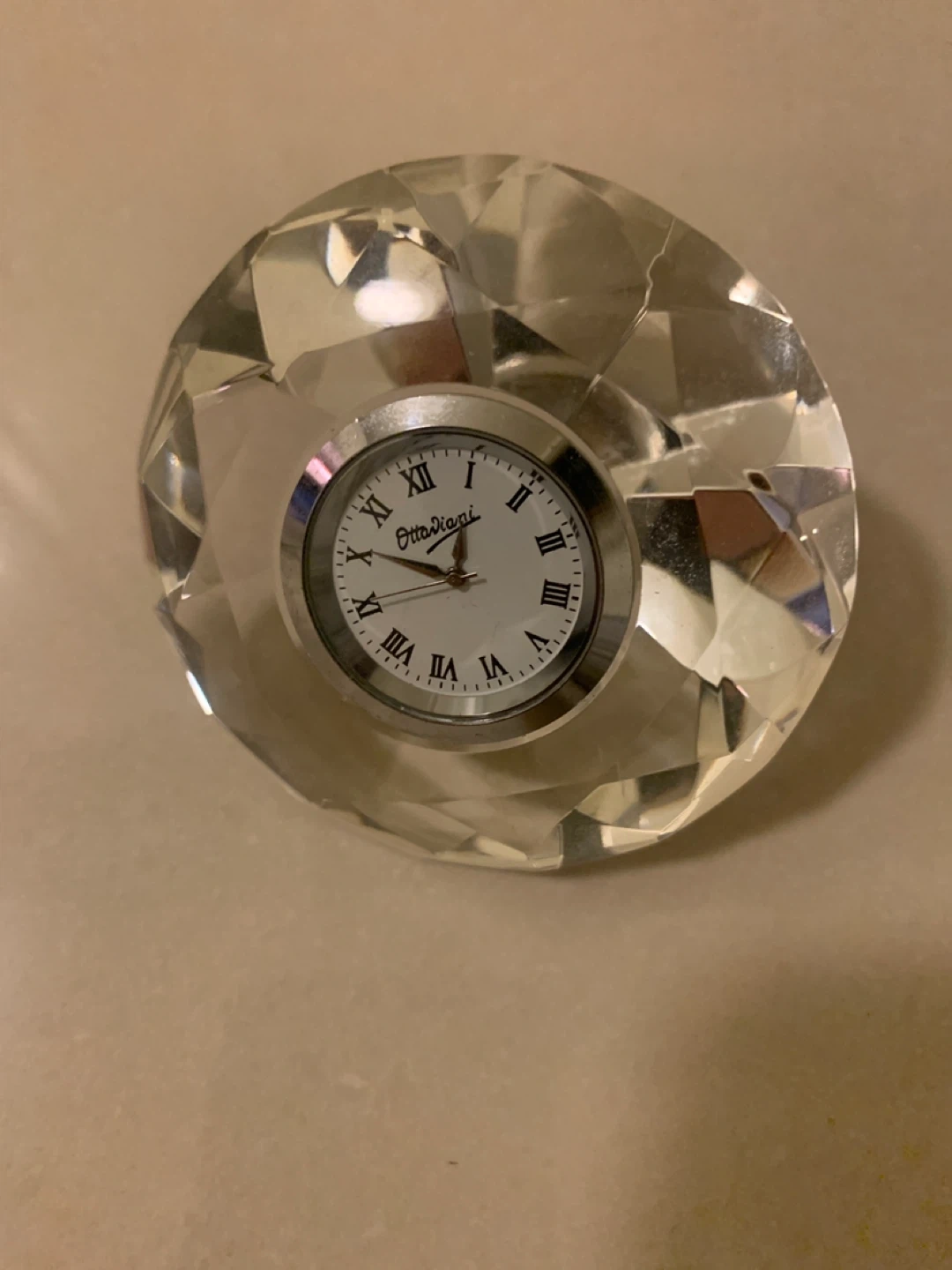 This Otto Diani clock features a clear crystal faceted design. It has Roman numeral hour markers. It's a decorative timepiece for a desk or shelf.