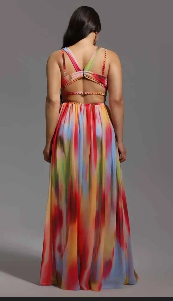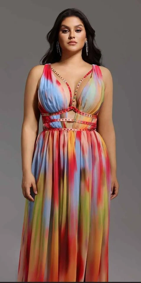 Vibrant maxi dress, super flowy. Has a cool tie-dye print with lots of bright colors like red, blue, yellow, orange. Deep V-neck and cute cutouts at the waist. Straps and waist have little beads, adds a nice touch. Great for summer parties or vacation. Still has tags on. XL (12-14).