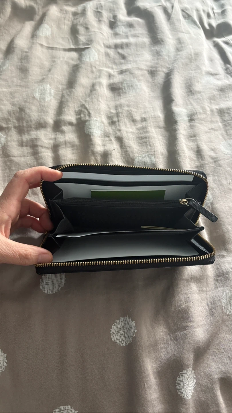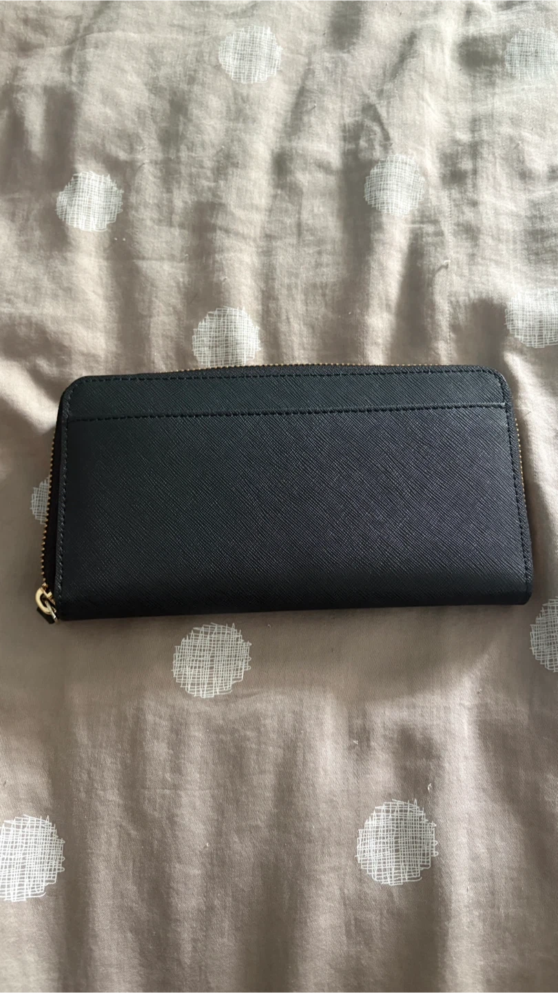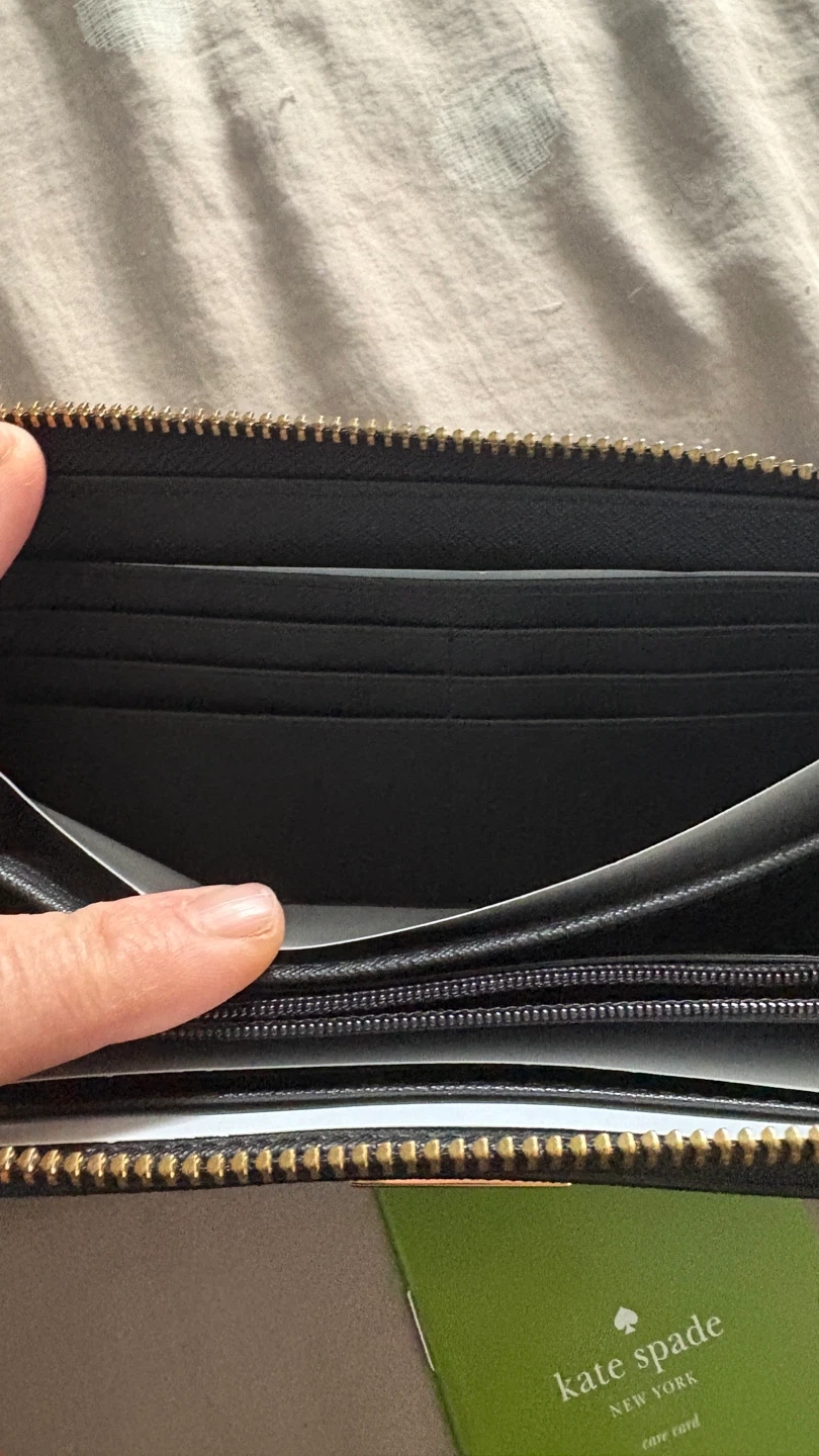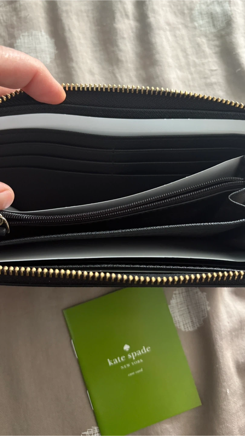 This is a black Kate Spade New York zip-around wallet. It features multiple card slots and compartments for organization.