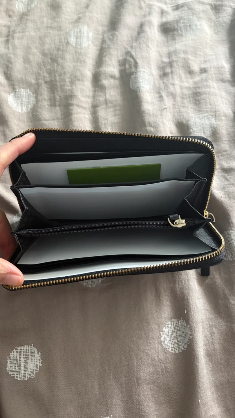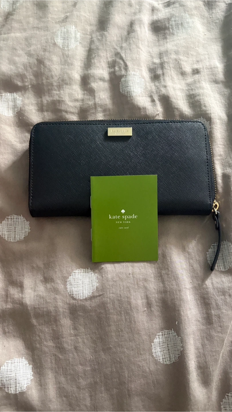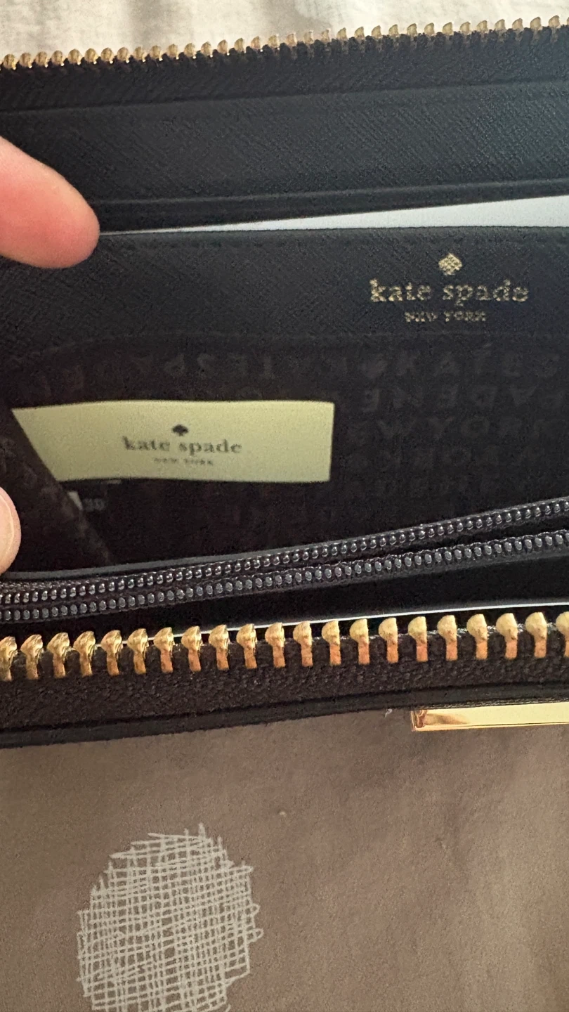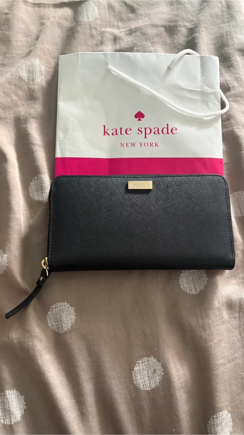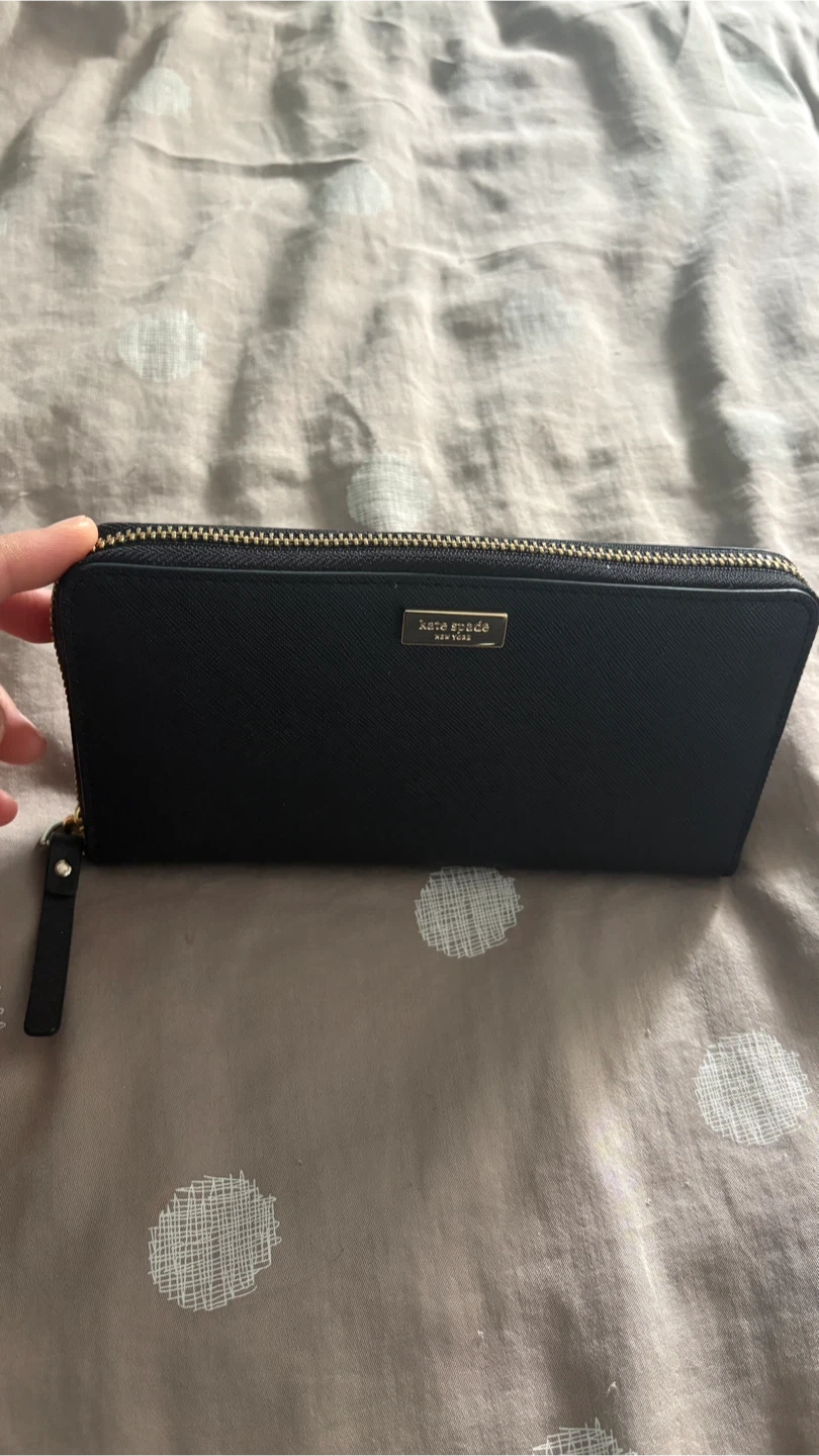 This is a black Kate Spade New York zip-around wallet. It features multiple card slots and compartments for organization.