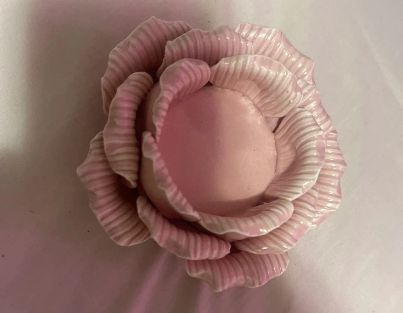Pink ceramic dish shaped like a rose. It's lovely for holding candles, jewellery, or small treasures. Perfect for a vanity or dresser!