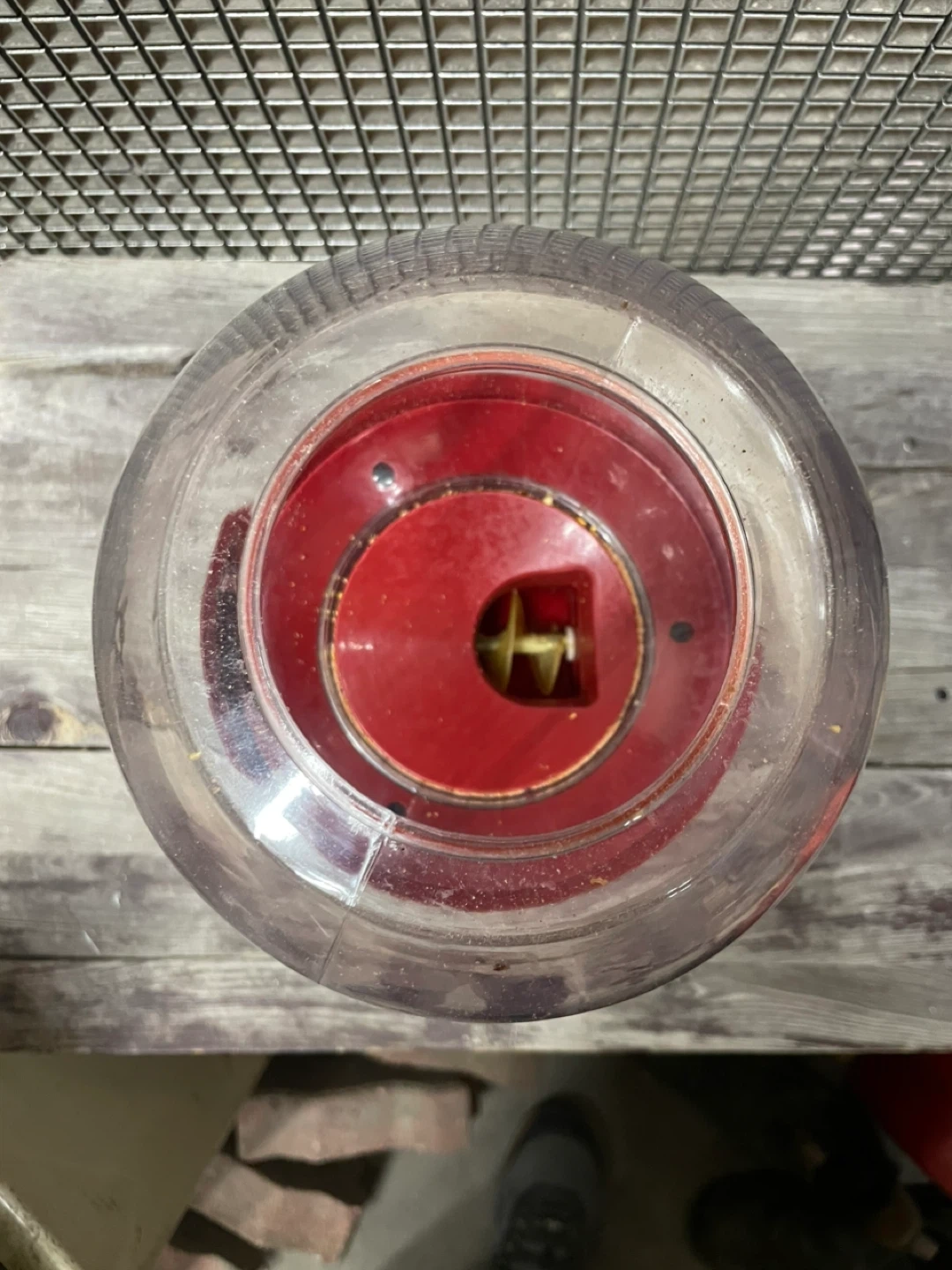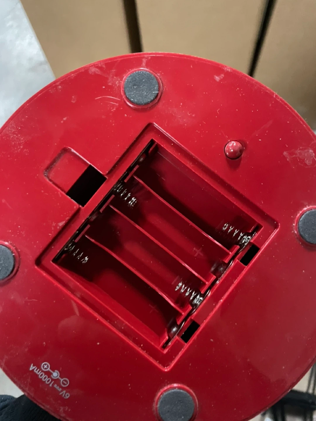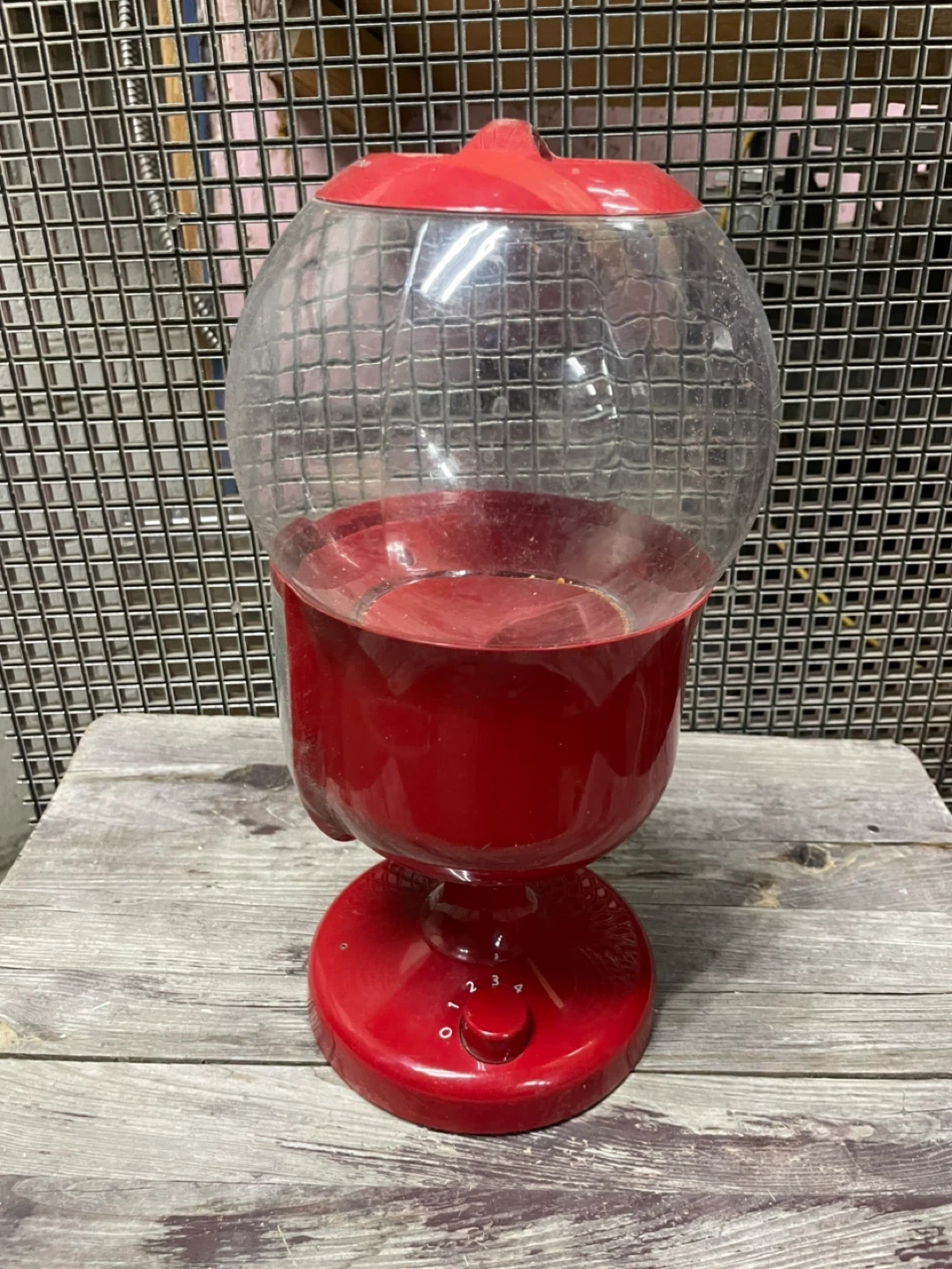 This is a red IceGrip gumball machine. It uses 4 AA batteries. The globe is clear plastic and the base is red plastic. It's ready for your favourite candy!