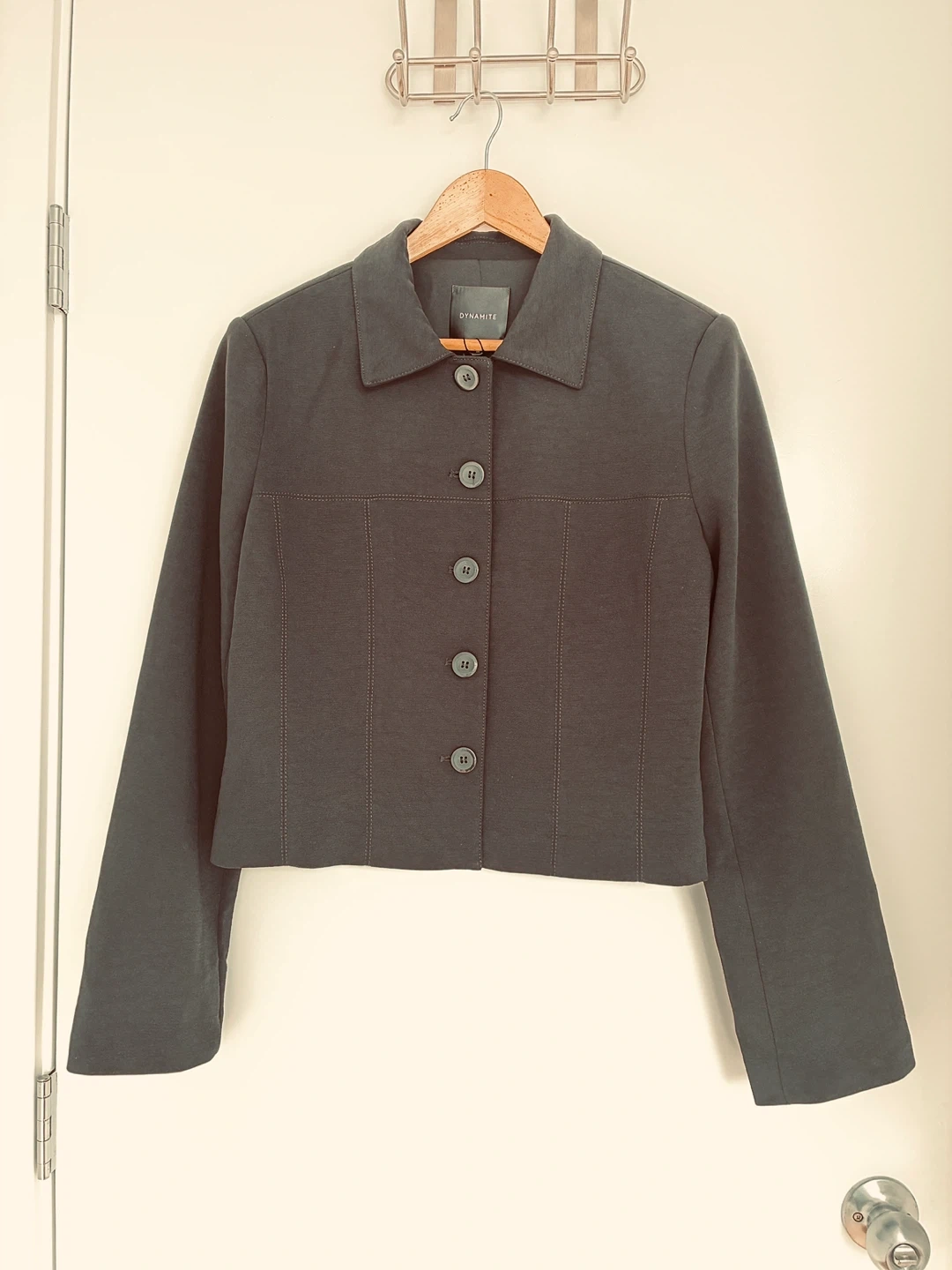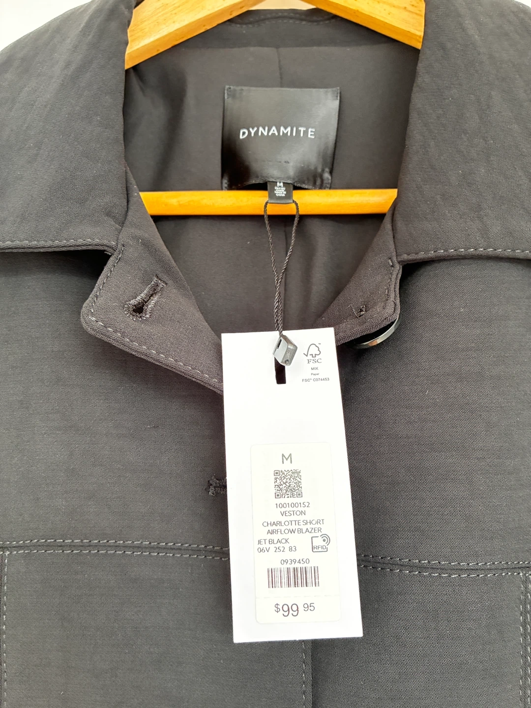 A Dynamite Charlotte Short Airflow Blazer in Jet Black. This blazer is size medium and made from 70% polyester and 30% recycled polyester. The lining is 100% polyester. It's a great layering piece for many occasions!