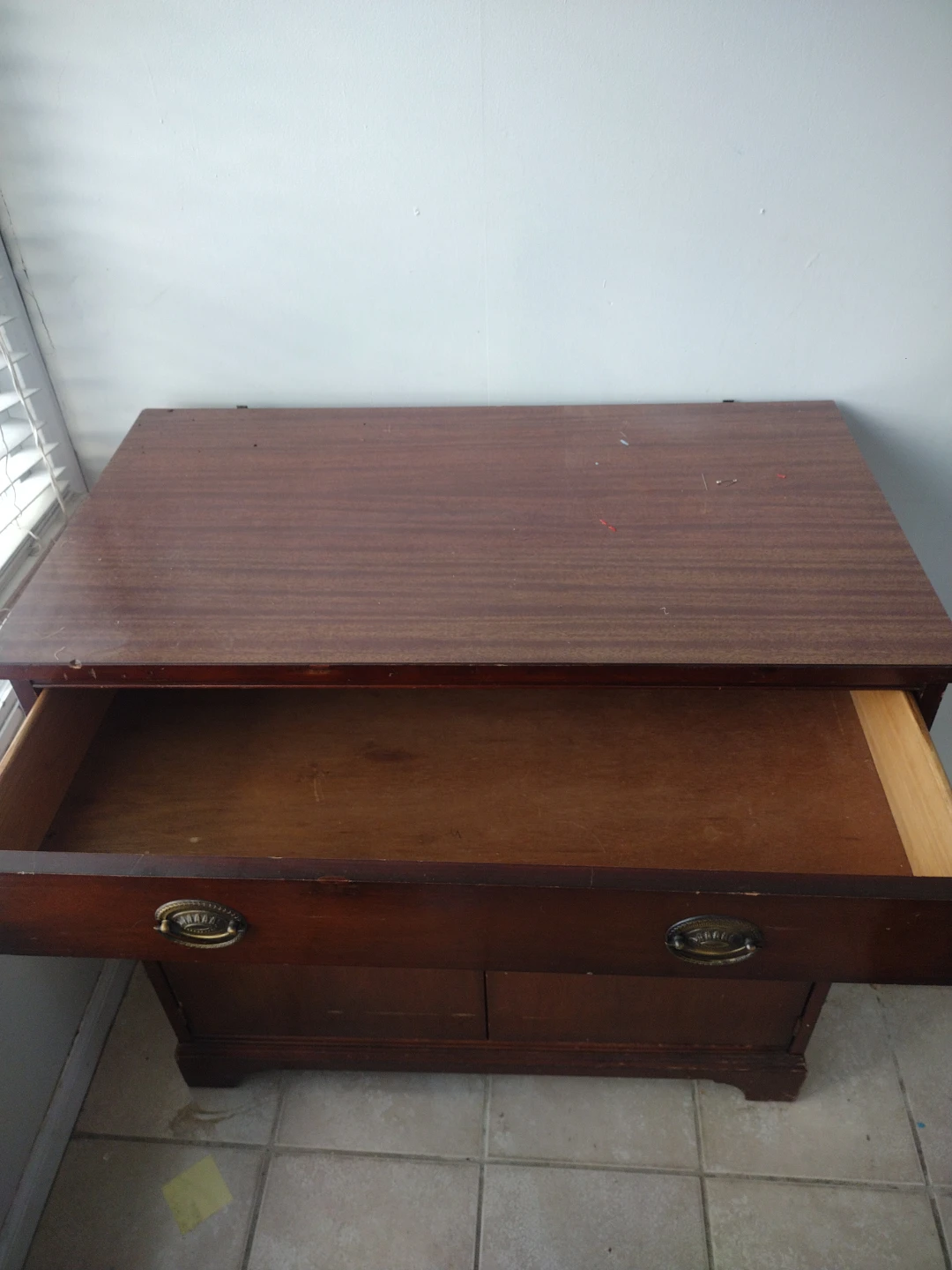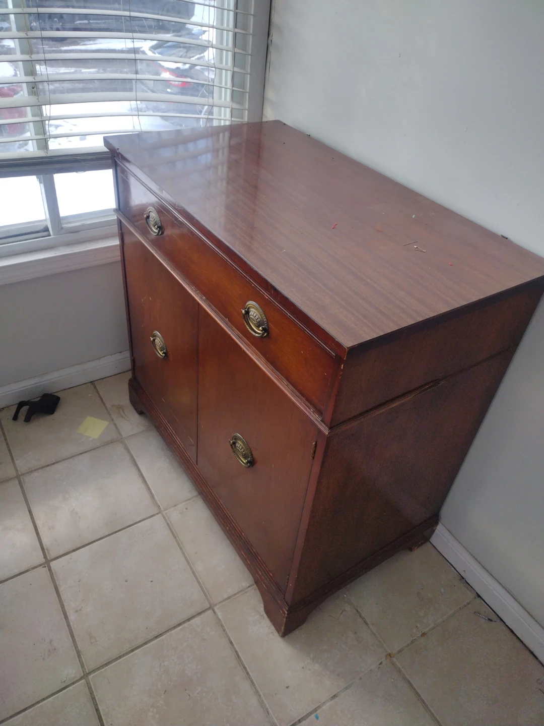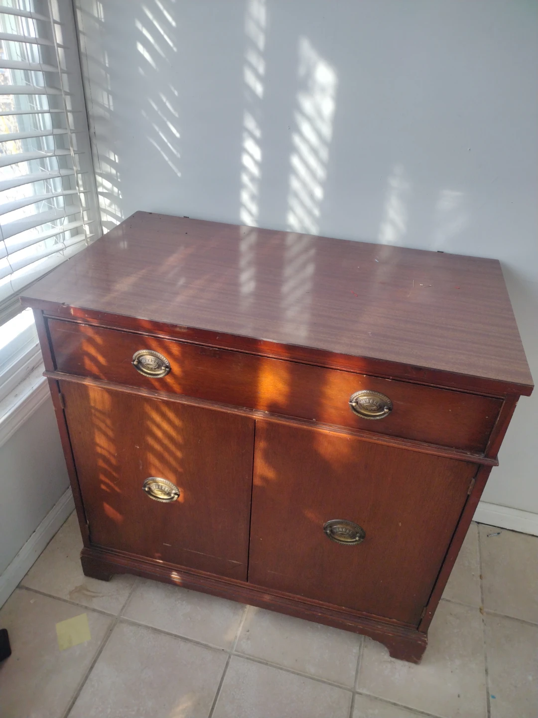 Selling a vintage wooden sideboard cabinet. It features a drawer and cabinet space, perfect for adding some classic charm to your home. It has some wear and tear, as pictured.