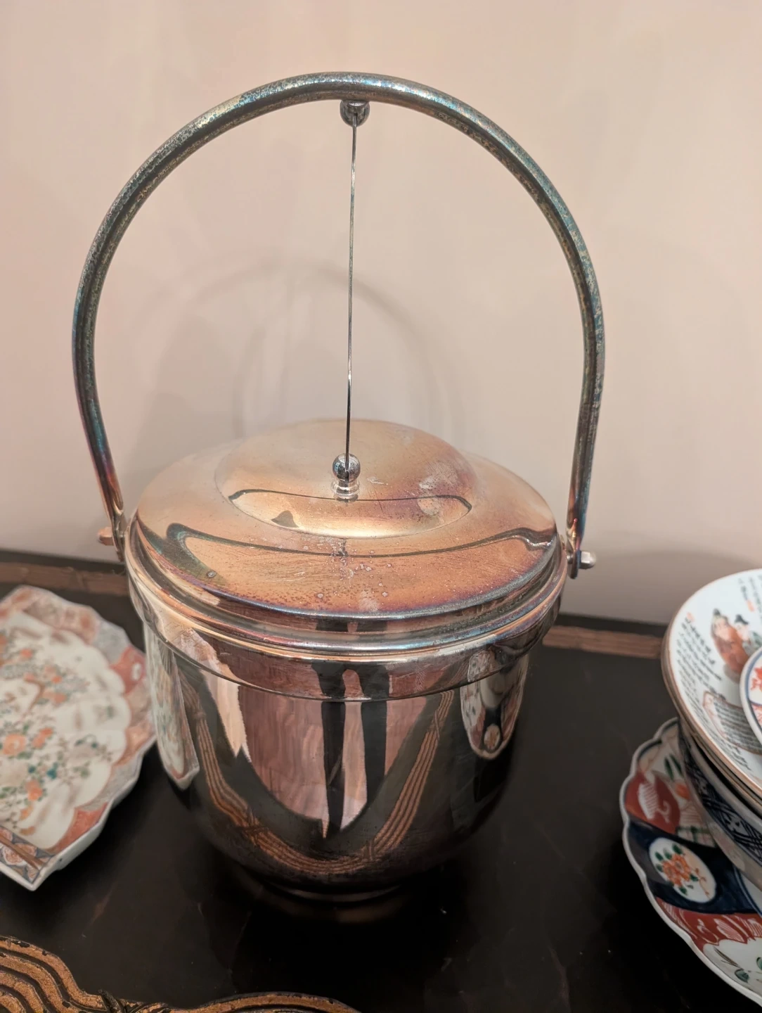 This vintage ice bucket features a silver-plated exterior and a white ceramic insert. It comes with a matching lid and a sturdy handle. It's perfect for keeping ice cold during gatherings.