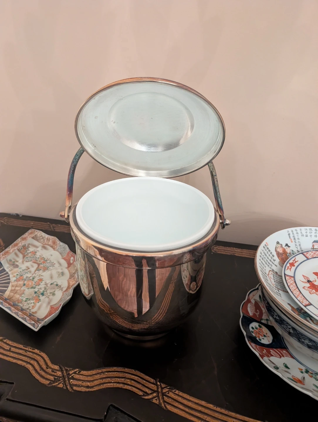 This vintage ice bucket features a silver-plated exterior and a white ceramic insert. It comes with a matching lid and a sturdy handle. It's perfect for keeping ice cold during gatherings.