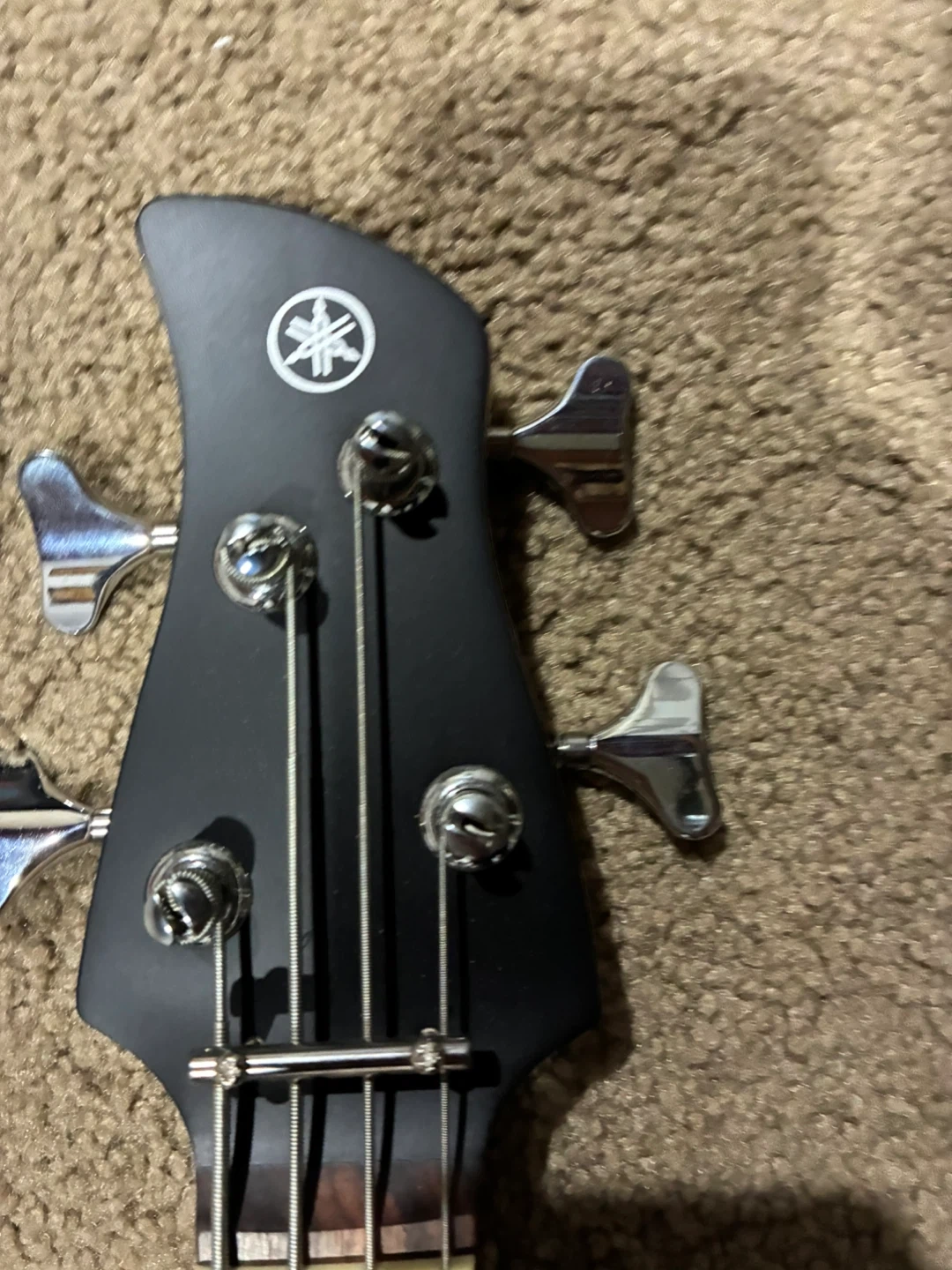 This is a black electric bass guitar by Yamaha. It features a sleek, glossy finish and a rosewood fingerboard. It's ready for practice or performance!