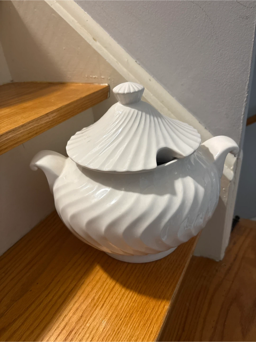 A classic white ceramic soup tureen with a fluted lid. It features elegant swirl detailing on the body and handles. This tureen is suitable for serving soups, stews, or other dishes at your table. Made in Japan