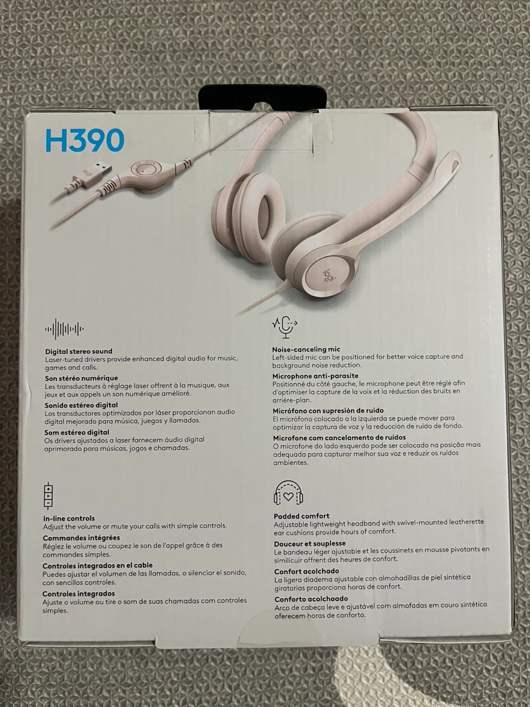 Selling a Logitech H390 USB computer headset in pink! It features digital stereo sound, a noise-canceling mic, in-line controls, and padded comfort. The lightweight headband has swivel-mounted leatherette ear cushions for hours of comfort
