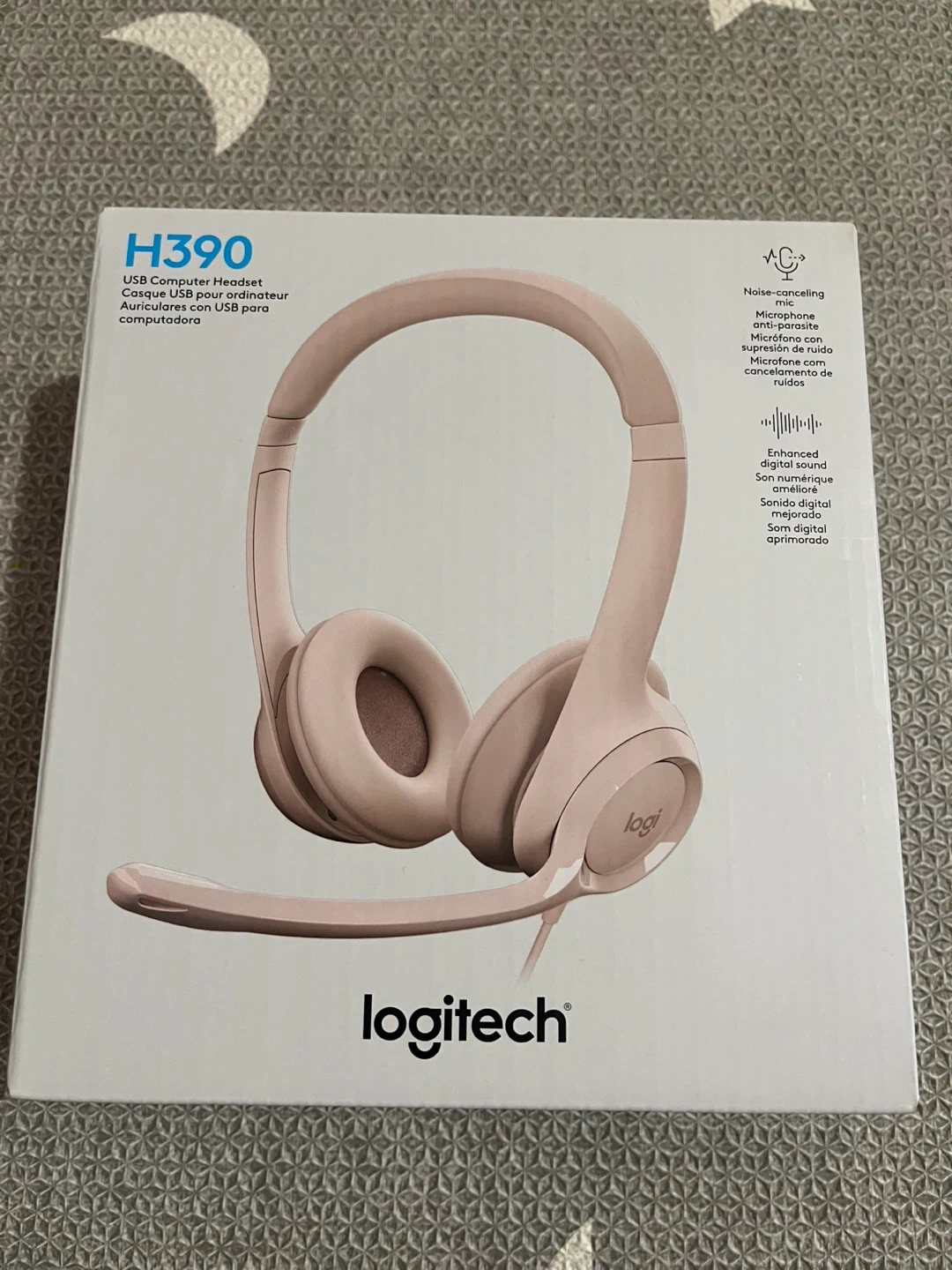 Selling a Logitech H390 USB computer headset in pink! It features digital stereo sound, a noise-canceling mic, in-line controls, and padded comfort. The lightweight headband has swivel-mounted leatherette ear cushions for hours of comfort