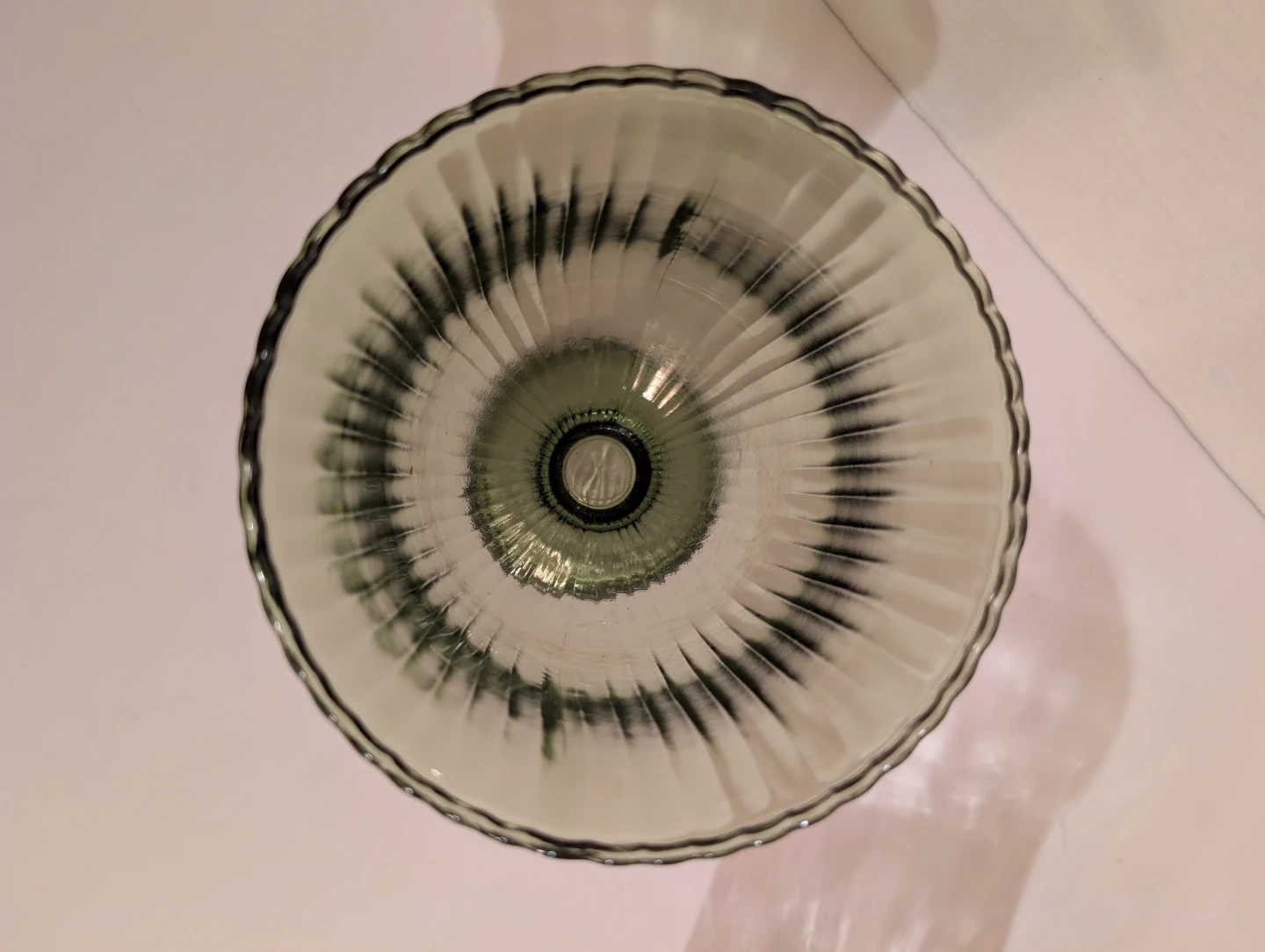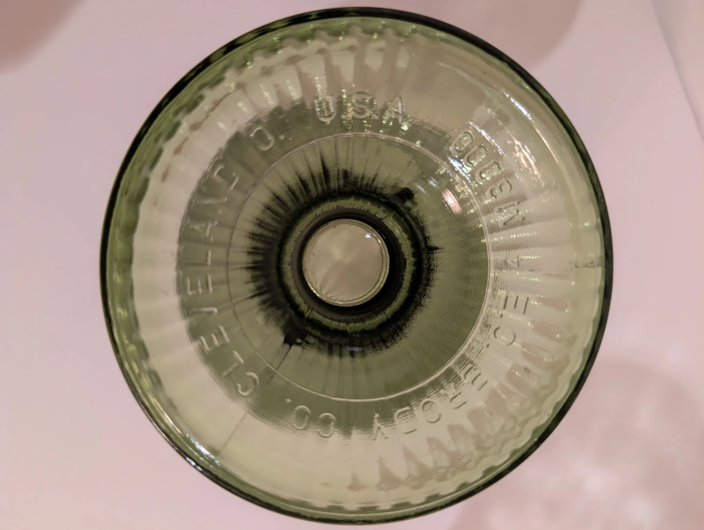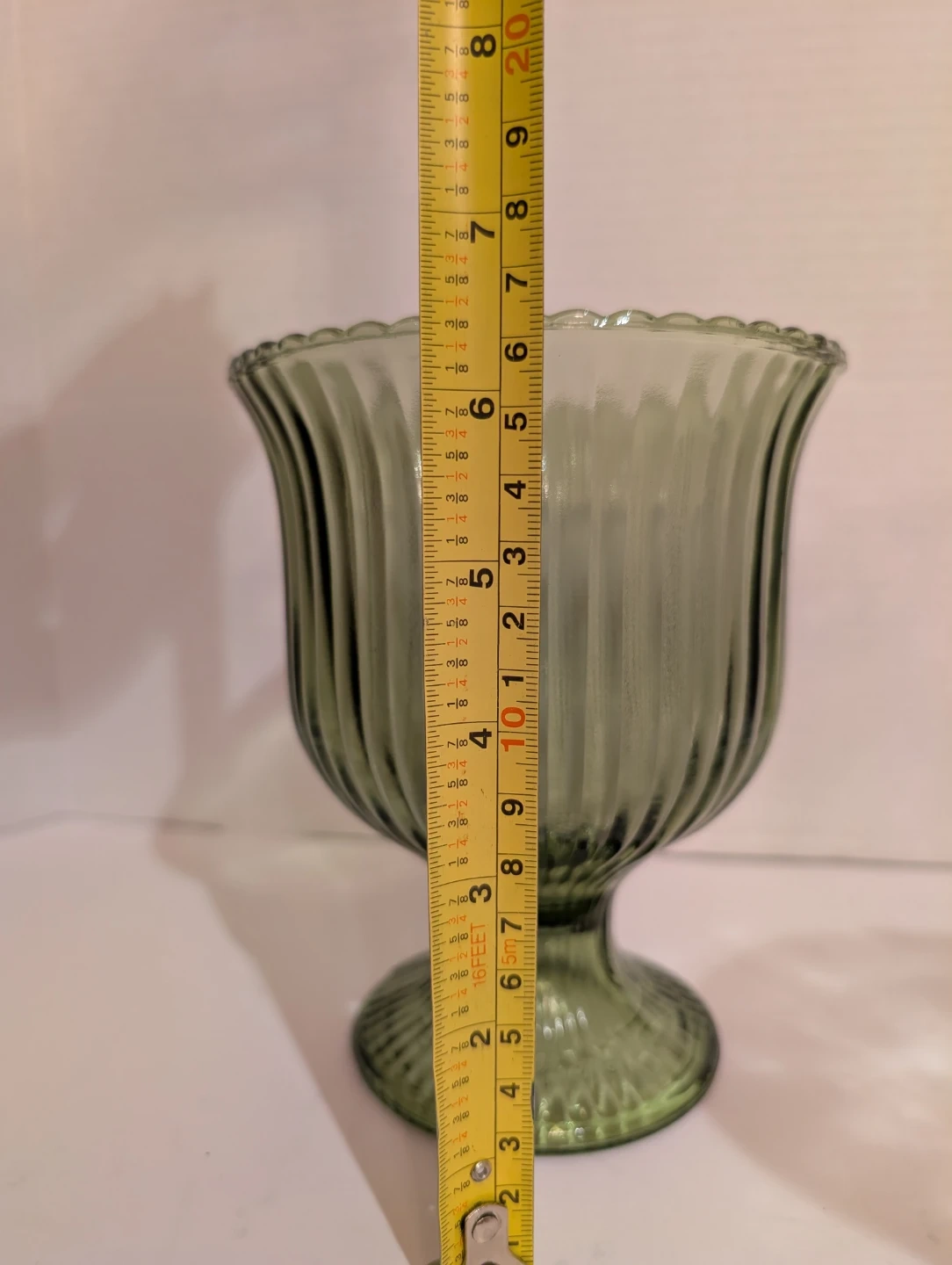 EO Brody Vintage green glass vase. It has a fluted rim and a ribbed pedestal base. Measures about 6.5 inches tall, 5 inch diameter. No chips or cracks, in excellent condition.