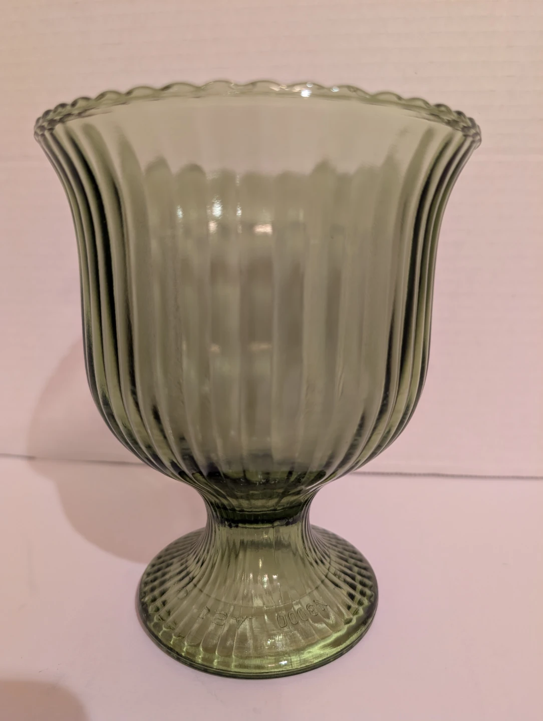 EO Brody Vintage green glass vase. It has a fluted rim and a ribbed pedestal base. Measures about 6.5 inches tall, 5 inch diameter. No chips or cracks, in excellent condition.