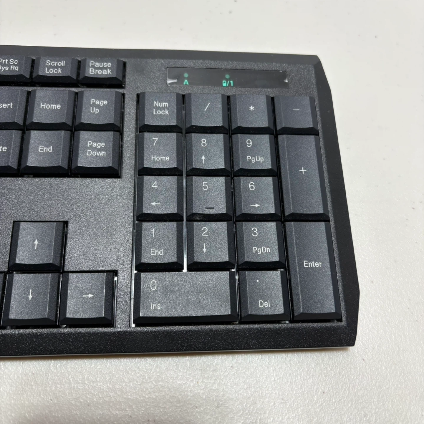 This is a TJ 2.4G wireless keyboard. It's black and includes a full number pad. Powered by 2 AA batteries, it's great for general computer use.