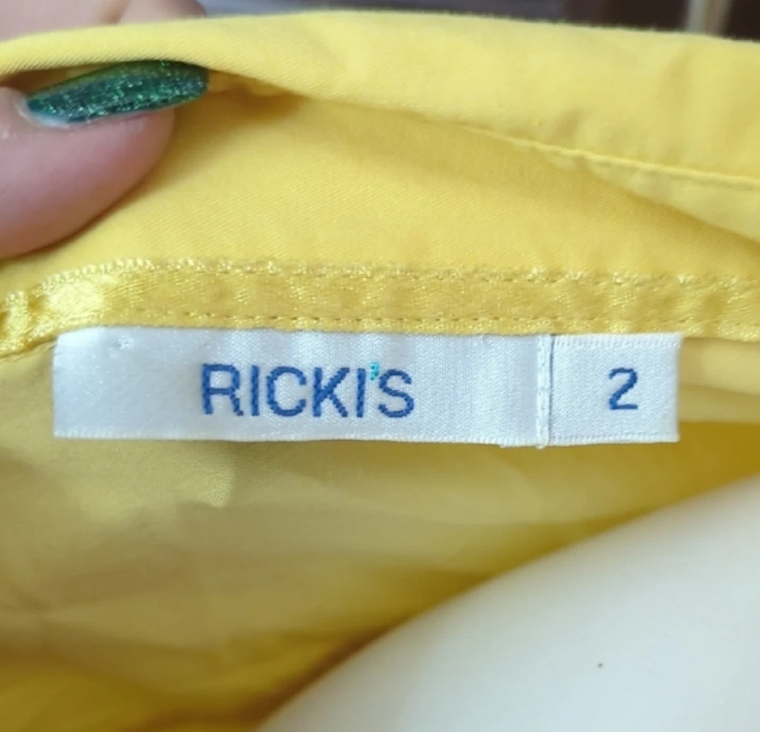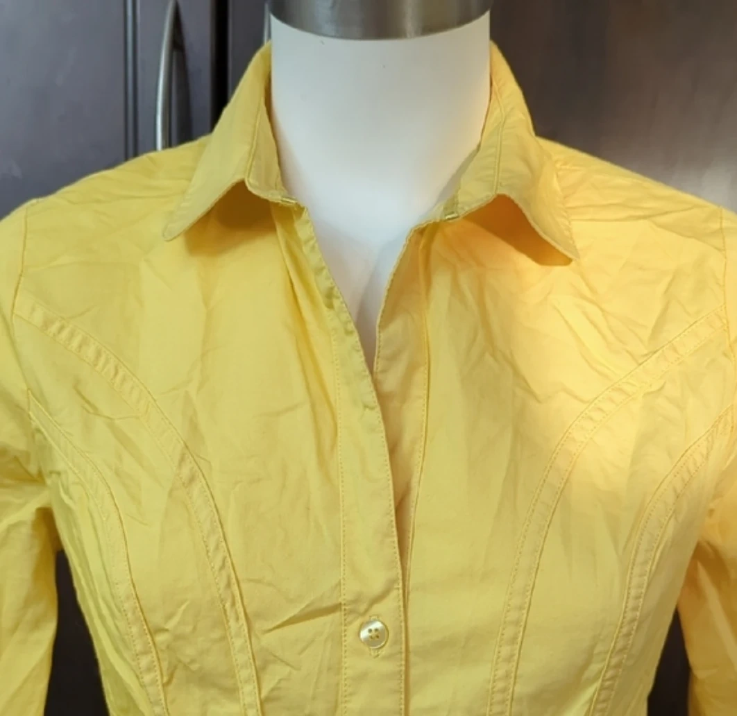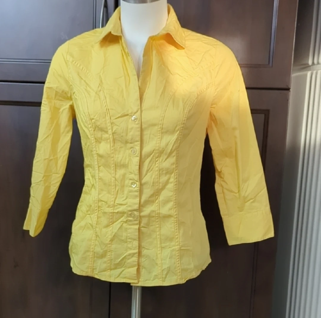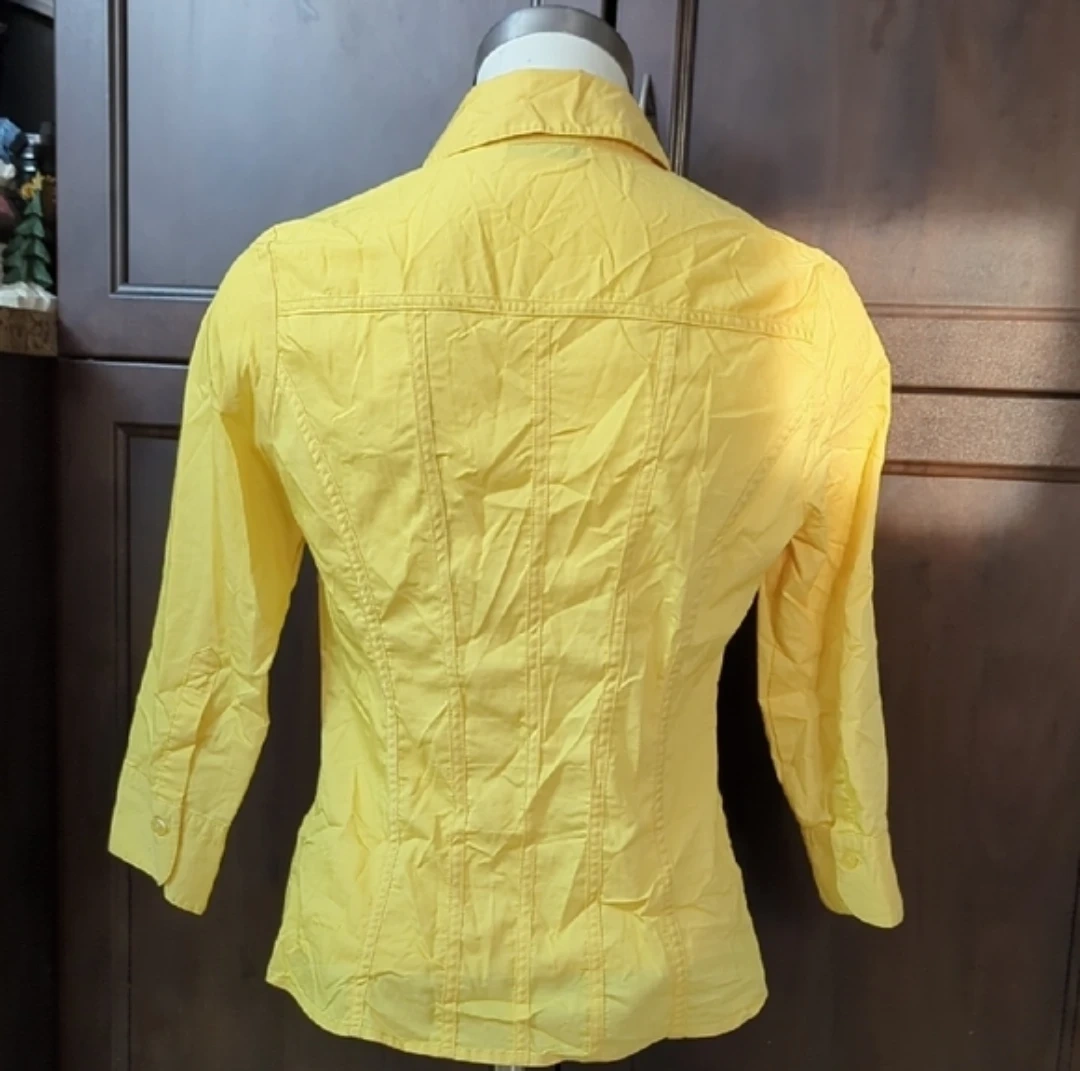 This yellow button-up shirt is made from a 60% cotton, 35% polyester, and 5% spandex blend. It's a size 2 and features a classic collar with 3/4 length sleeves. A versatile piece for any wardrobe!