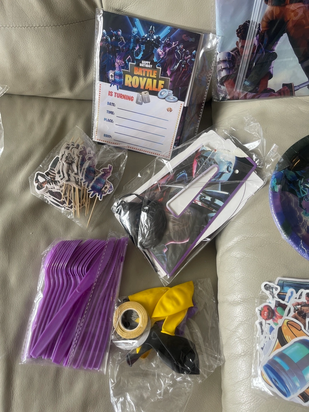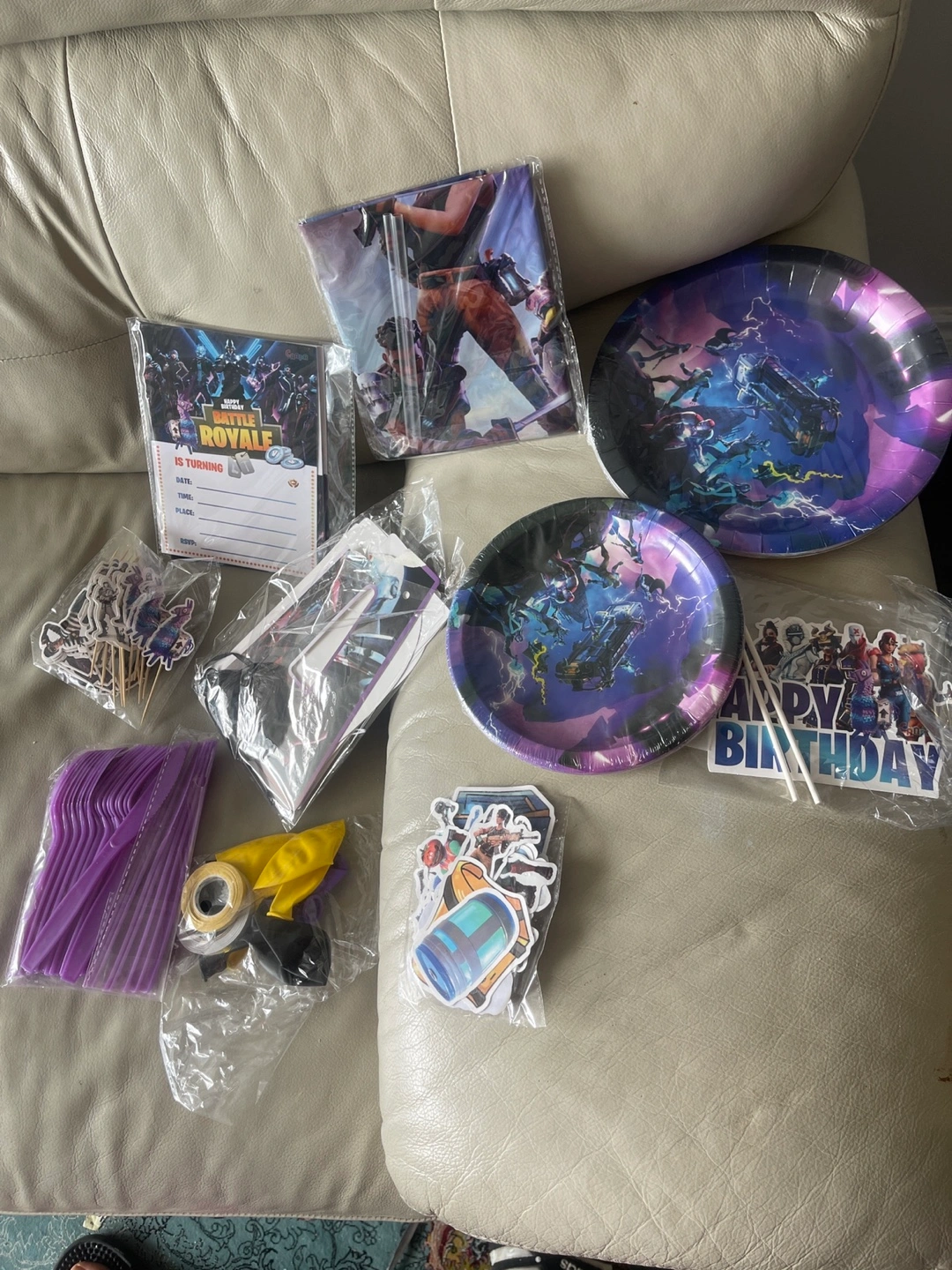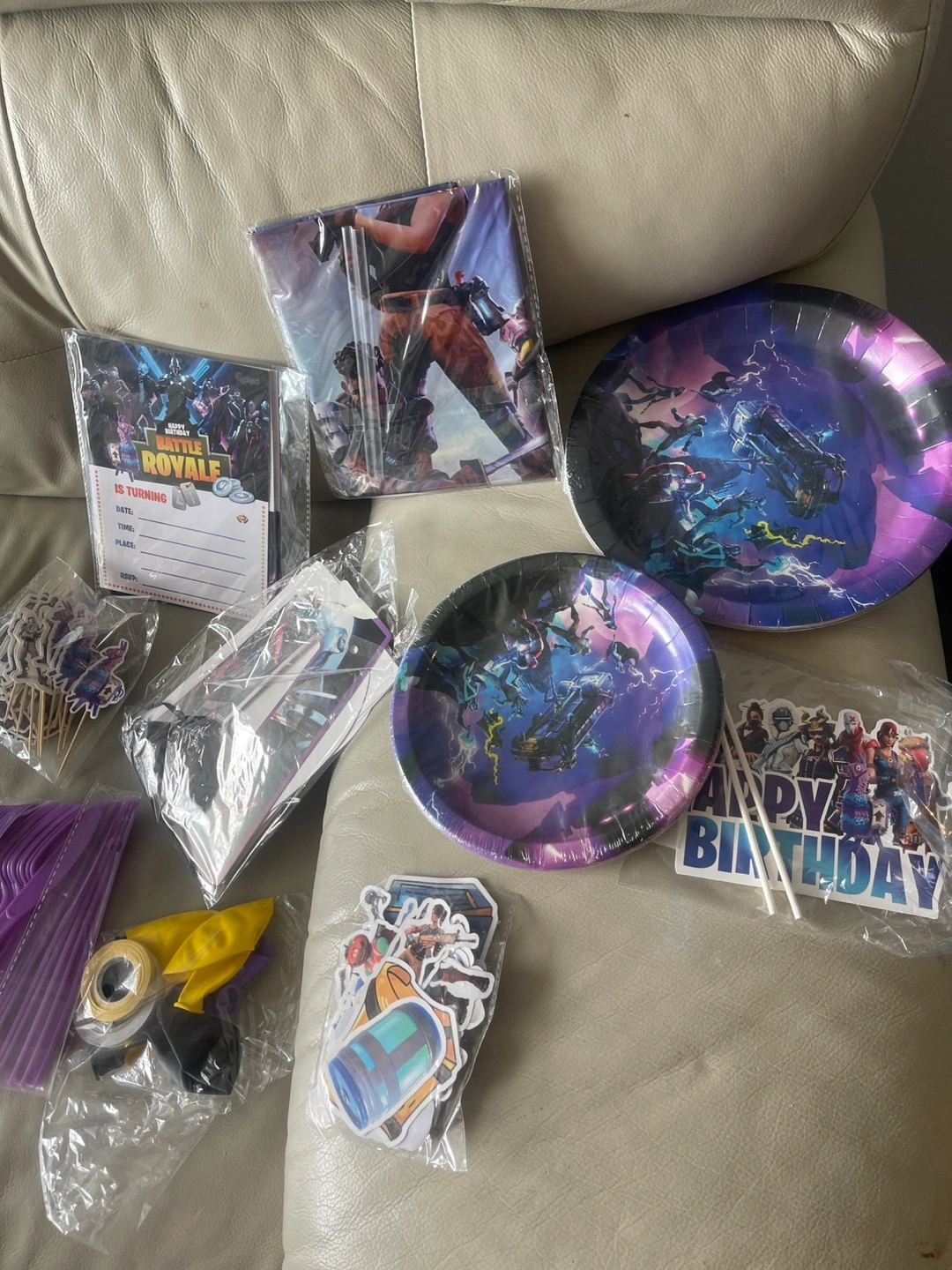 Complete Fortnite party kit. Includes plates, cutlery, invitations, cake toppers, banner, and more. Perfect for a Fortnite-themed birthday celebration. All items are new and unopened.