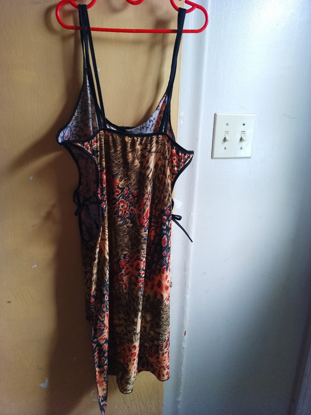 This is a women's slip dress or lingerie piece. It features a colourful animal and floral print. Adjustable spaghetti straps and tie sides for a custom fit. Lightweight fabric.