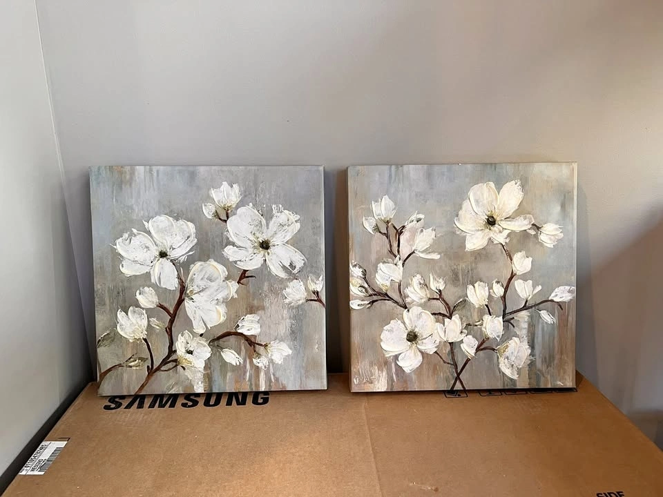 Set of two floral paintings on canvas, featuring grey, white, and brown colors.