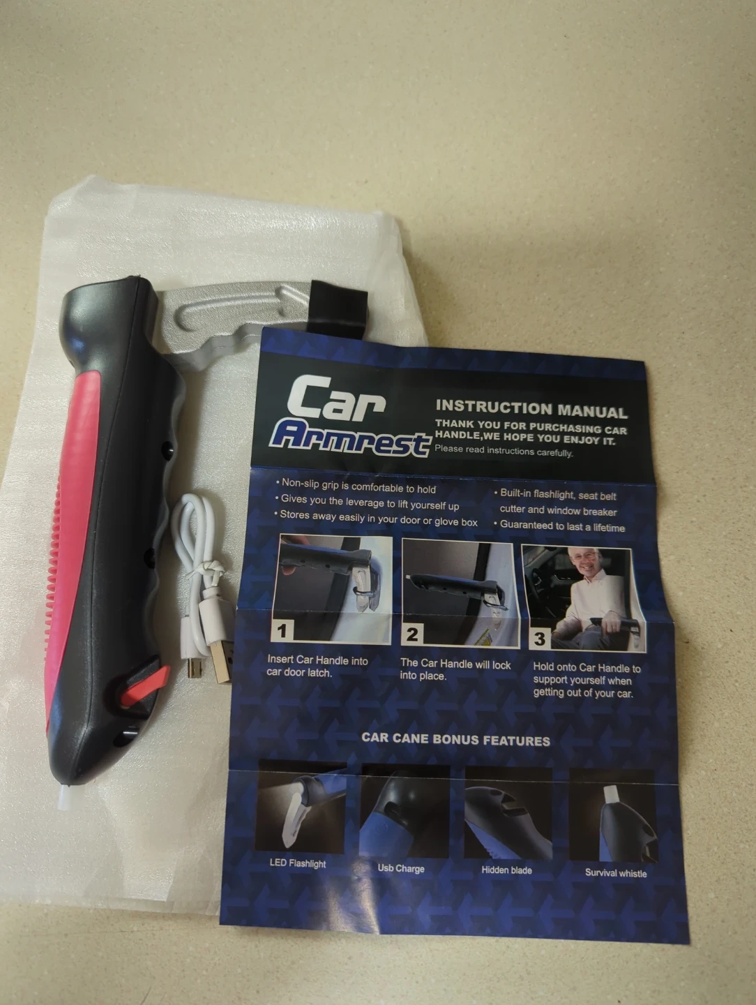 This Car Armrest provides leverage to help you lift yourself up when exiting your vehicle. It features a non-slip grip and stores easily in your door or glove box. It also has a built-in flashlight, seatbelt cutter, and window breaker.